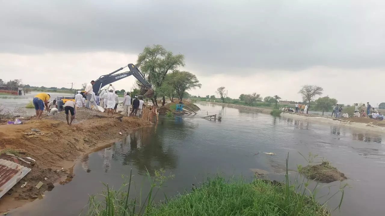हिसार के कैमरी गांव में ड्रेन टूटने से हुए जलभराव को रोकते कर्मचारी व ग्रामीण।