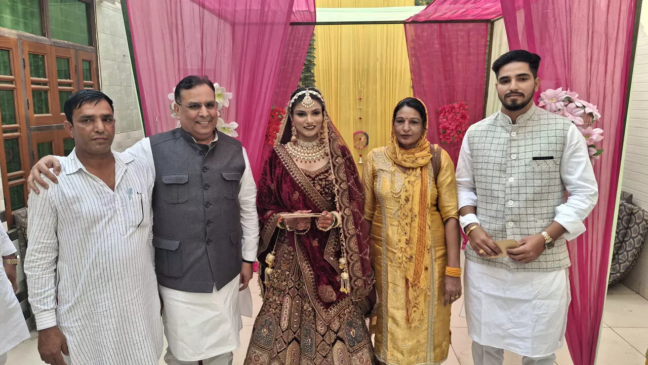 गांव पेटवाड़ में पूर्व चेयरमैन राजेश दुहन की बेटी व बेटे को आशीर्वाद देते पूर्व वित्त मंत्री कैप्टन अभिमन्यु।