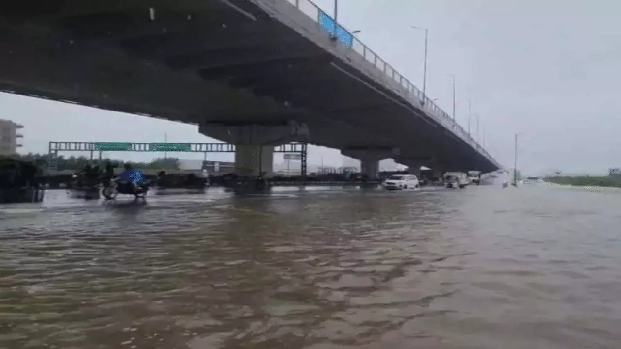 गुरुग्राम के द्वारका एक्सप्रेसवे पर भरा बारिश का पानी।