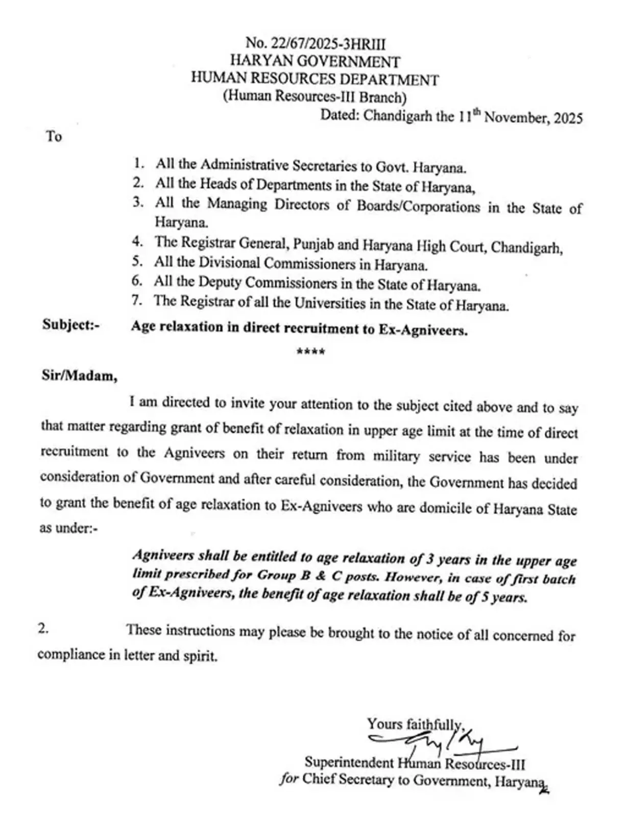 Agniveer: हरियाणा के अग्निवीरों के लिए सरकार का फैसला, ग्रुप-B-C पदों पर मिलेगी ये सुविधा, देखें नोटिफिकेशन