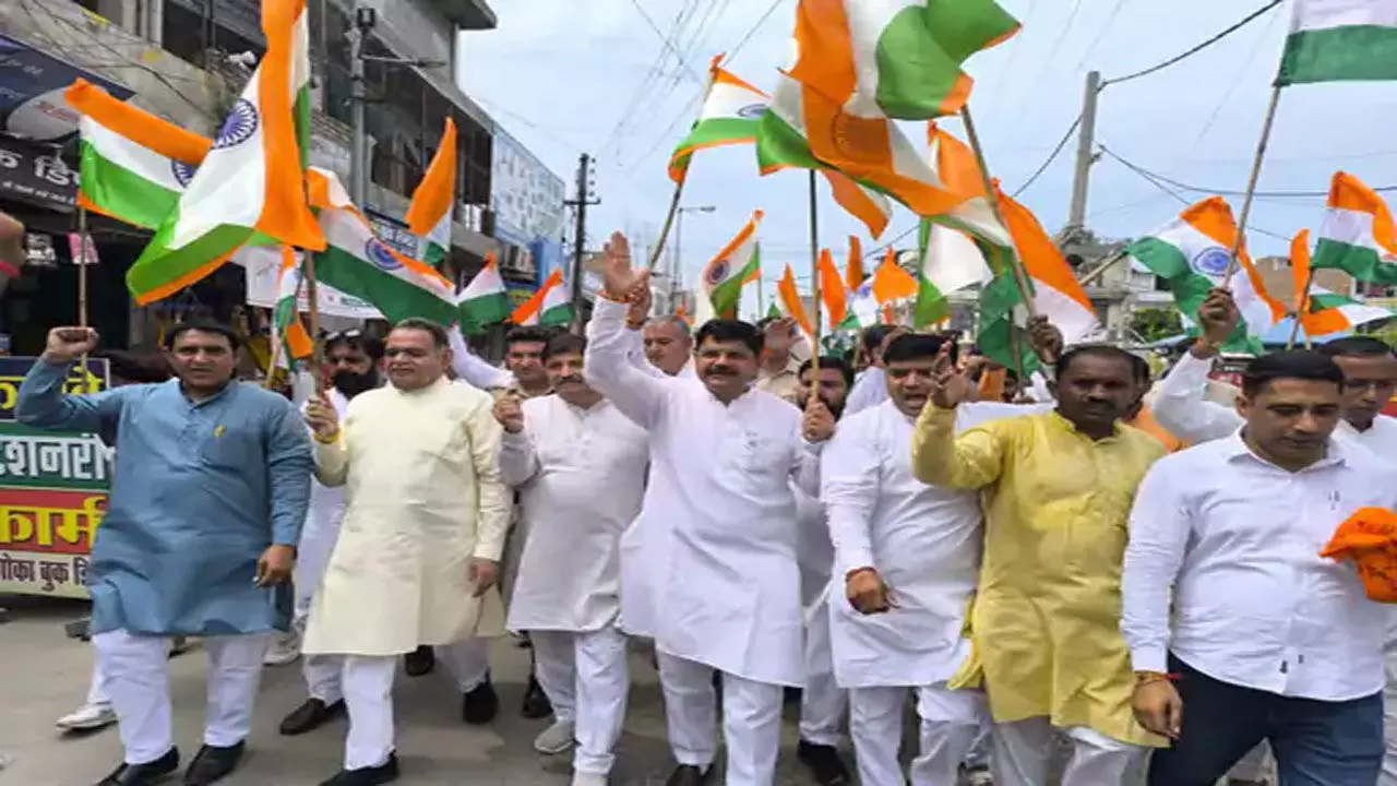 हांसी में तिरंगा यात्रा निकालते भाजपा नेता।
