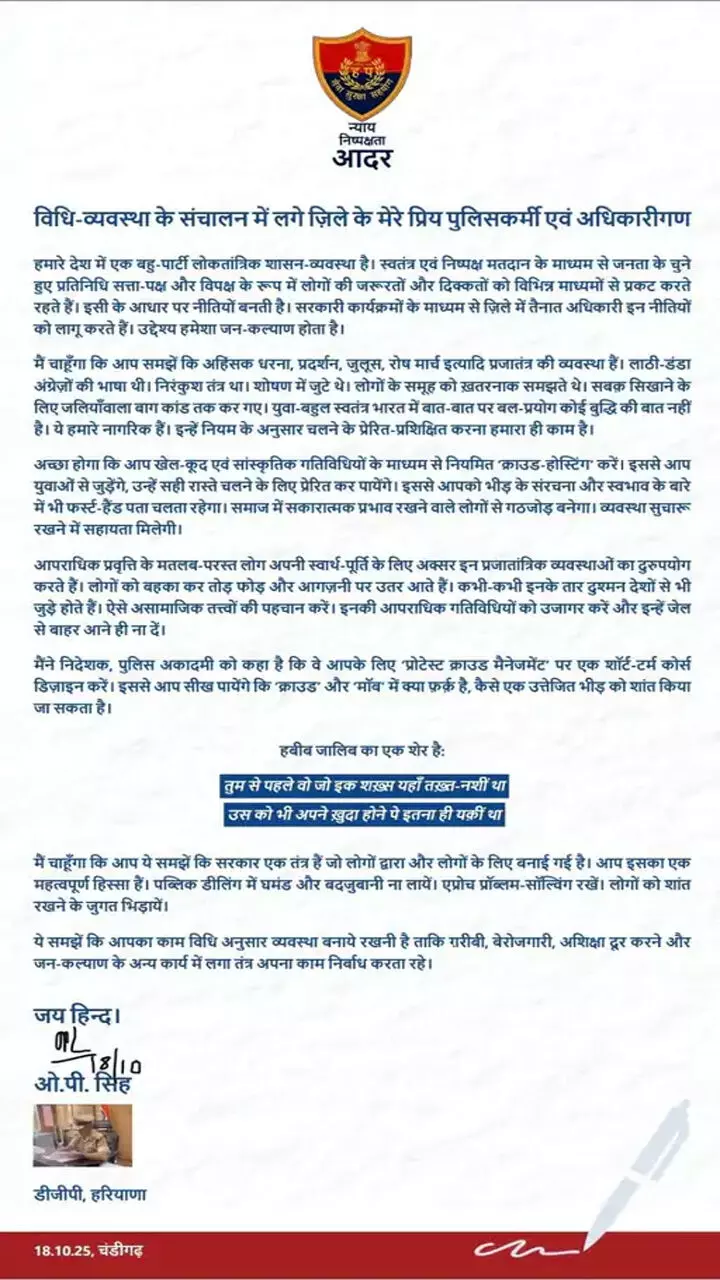 हरियाणा के नए कार्यवाहक कार्यभार संभालने के बाद से ही अफसरों को चिट्टी लिख रहे हैं। शुक्रवार को तीसरी चिट्टी लिखी। जिसमें ओपी सिंह ने पुलिस अधिकारियों को 'क्राउड' (भीड़) और 'मॉब' (उपद्रवी भीड़) का अंतर बताते हुए कहा कि पुलिसकर्मियों को भीड़ और उपद्रवी भीड़ के बीच अंतर समझाना और उन्हें कानून व्यवस्था बनाए रखने के दौरान उचित कार्रवाई करने के लिए मार्गदर्शित करना है। डीजीपी ने कानून व्यवस्था में लगे पुलिस अधिकारियों व कर्मचारियों को लिखा कि भारत एक बहु पार्टी लोकतांत्रित देश है। जहां स्वतंत्र और निष्पक्ष मतदान से जनता सत्तापक्ष और विपक्ष के लिए अपने प्रतिनिधियों का चुनाव करती है। जो जनता की जरूरतों और परेशानियों को अलग अलग माध्यमों से प्रकट करते हैं। उन्होंने चिट्ठी में लिखा कि लाठी डंडा निरंकुश तंत्र अंगेजों की भाषा थी। शांतिपूर्ण धरने, प्रदर्शन व रोष मार्च प्रजातांत्रिक व्यवस्था है। ऐसे में युवा बाहुल स्वतंत्र भारत में बात बात पर बल का प्रयोग करना बुद्धि की बात नहीं है। उन्होंने पुलिस अधिकारियों व कर्मचारियों को अधिकारियों को 6 बिंदुओं पर काम करने की सलाह दी।