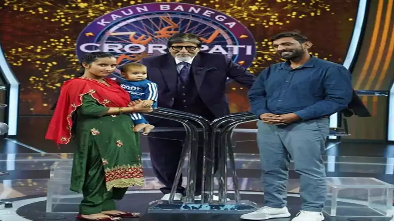 KBC शो के मंच पर अमिताभ बच्चन के साथ मौजूद सोनू और उसकी पत्नी।