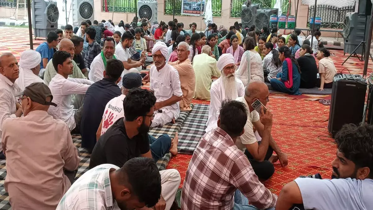 हिसार के हरियाणा कृषि विश्वविद्यालय में धरने पर बैठे छात्र व विभिन्न संगठनों के प्रतिनिधि।
