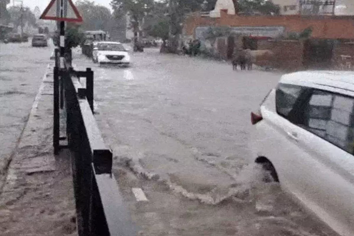भिवानी में बारिश के बाद सड़क पर जलजमाव व पानी के बीच से गुजरते वाहन।