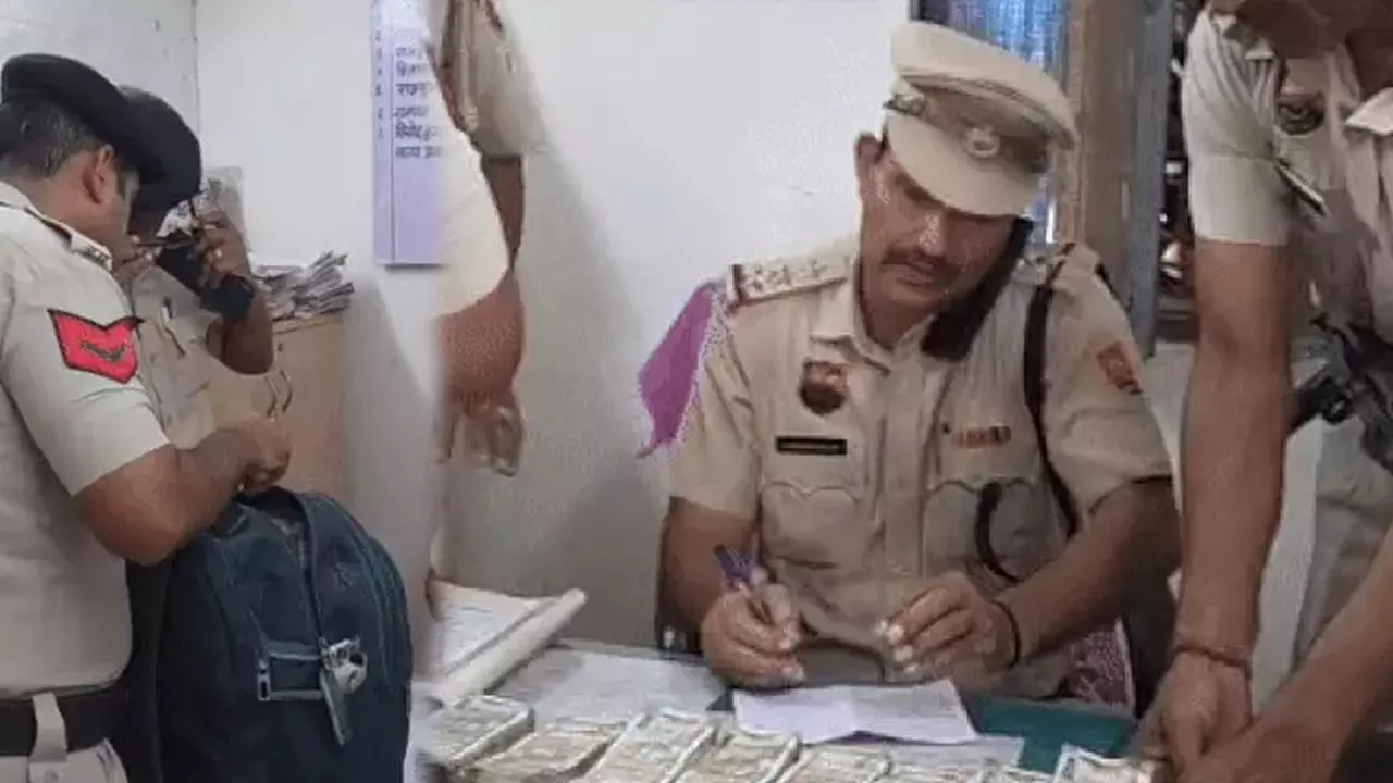 बहादुरगढ़ में ट्रेन से मिले बैग से बरामद नकदी को गिनते पुलिस कर्मचारी।