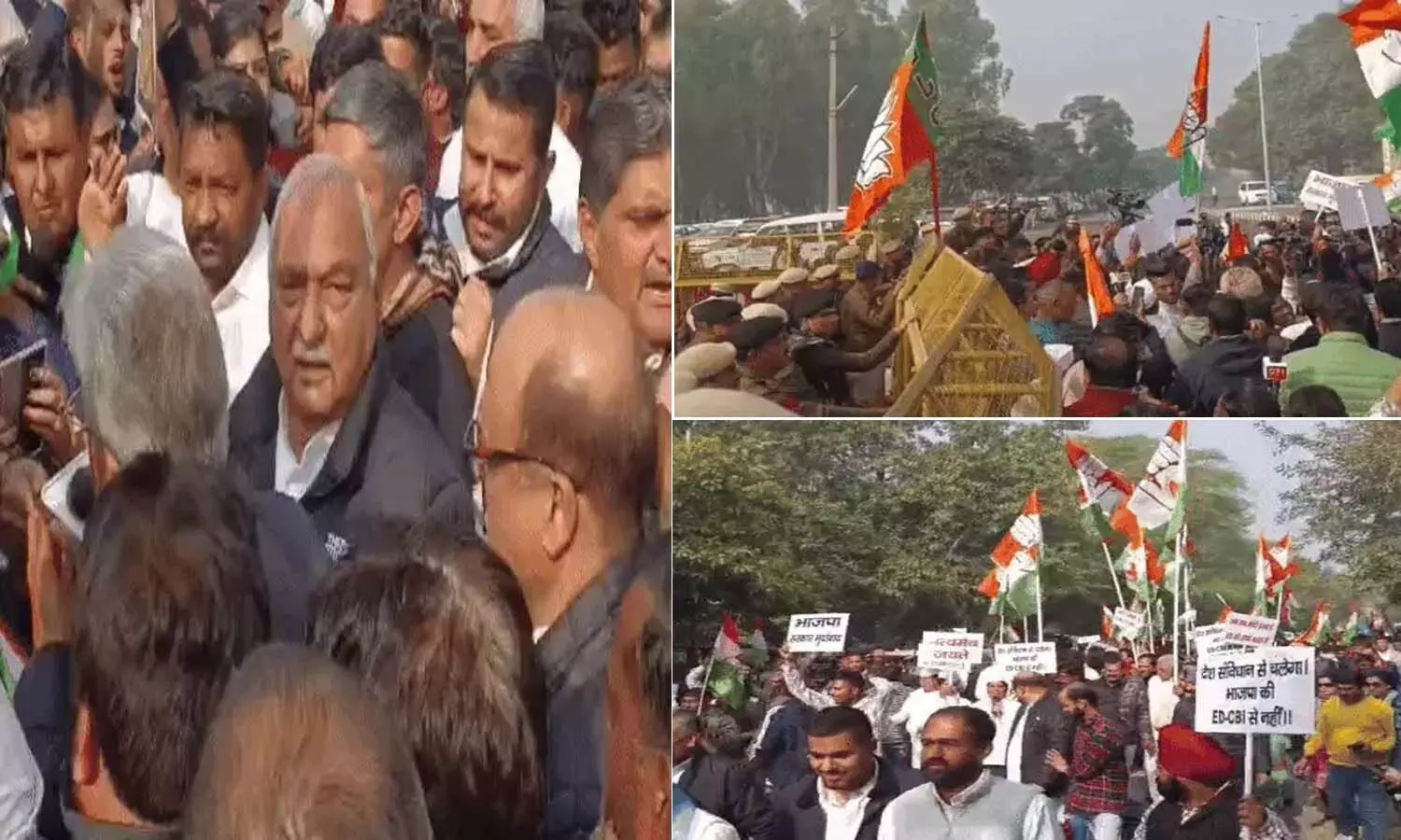 पंचकूला में पूर्व मुख्यमंत्री भूपेंद्र हुड्डा के नेतृत्व में प्रदर्शन करते कांग्रेस कार्यकर्ता।