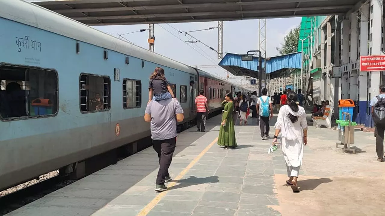 सोनीपत रेलवे स्टेशन पर खड़ी रेलगाड़ी और इंतजार करते यात्री।