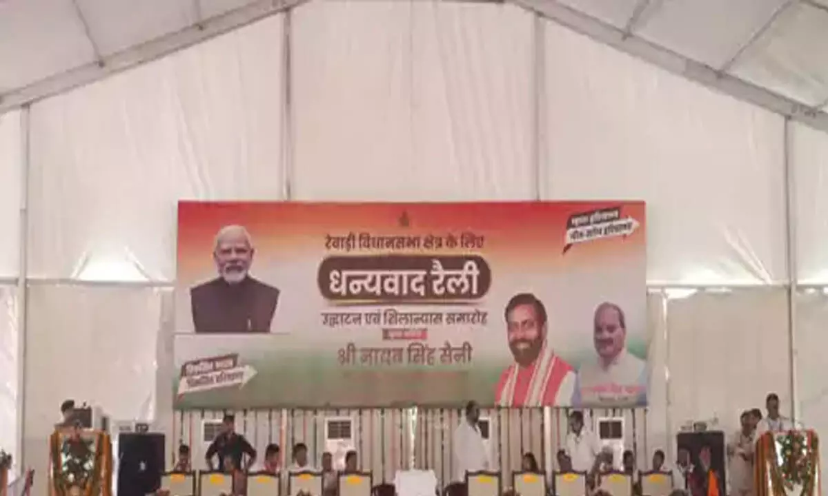 मुख्यमंत्री नायब सिंह सैनी ने हरियाणा के रेवाड़ी के राव तुलाराम स्टेडियम में आयोजित 'धन्यवाद रैली' में क्षेत्र के लिए कई महत्वपूर्ण विकास परियोजनाओं की घोषणा की। इस दौरान उन्होंने कुल 288 करोड़ रुपये की 15 परियोजनाओं का शिलान्यास व उद्घाटन किया। रैली से पहले मुख्यमंत्री ने रेवाड़ी जेल का भी उद्घाटन किया। इस अवसर पर केंद्रीय मंत्री राव इंद्रजीत सिंह, स्वास्थ्य मंत्री डॉ. आरती राव, तिजारा विधायक बाबा बालकनाथ और जेल मंत्री डॉ. अरविंद शर्मा सहित कई प्रमुख नेता मौजूद रहे।