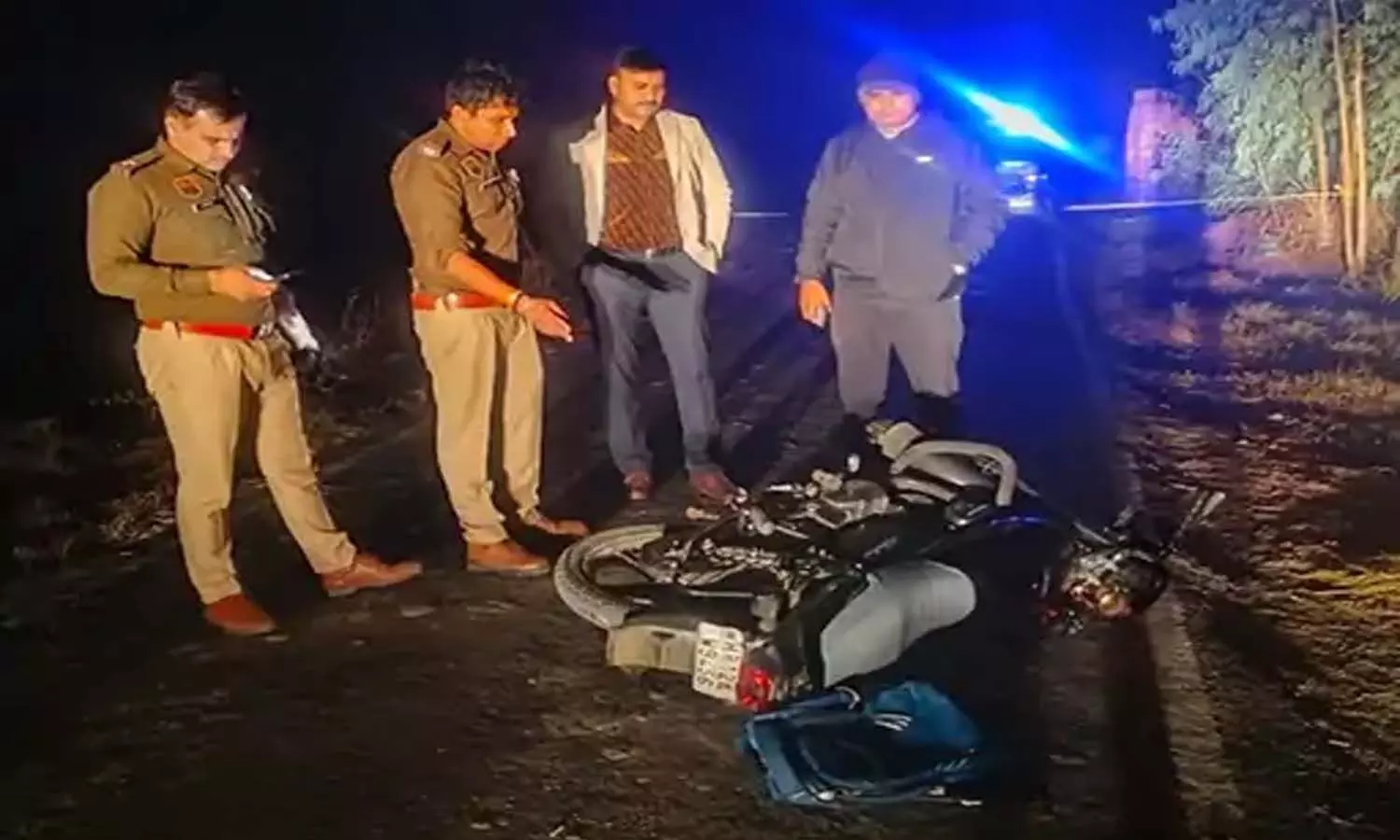 मुठभेड़ के बाद बाइक की जांच करती पुलिस टीम।