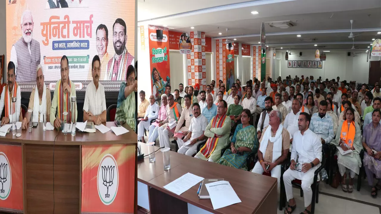 हरियाणा भाजपा ने सरदार वल्लभभाई पटेल की 150वीं जयंती पर भारतीय जनता पार्टी ने हर जिले में यूनिटी मार्च निकालने की एक बड़ी योजना बनाई है। 31 अक्टूबर से 25 नवंबर तक होने वाले सरदार पटेल यूनिटी मार्च के दौरान अनेक प्रकार शैक्षणिक प्रतियोगिताएं, सफाई अभियान और अन्य सेवा कार्य किए जाने की कार्य योजना भाजपा ने तैयार कर ली है। बुधवार को रोहतक के प्रदेश भाजपा कार्यालय में प्रदेशाध्यक्ष मोहन लाल बड़ौली, संगठन महामंत्री फणीन्द्रनाथ शर्मा ने प्रदेश के सभी जिला अध्यक्षों, प्रभारियों, प्रदेश पदाधिकारियों के साथ बैठकर कार्यक्रम की रूपरेखा तैयार की। बड़ौली ने कहा कि 31अक्टूबर से 25 नवंबर तक होने वाले सरदार 150 यूनिटी मार्च की पूरी योजना बनकर तैयार हो गई है। उन्होंने बताया कि सरदार वल्भभाई पटेल की जयंती के उपलक्ष्य में जिला और लोकसभा स्तर पर होने वाले कार्यक्रमों को लेकर कार्यकर्ताओं को कार्य वितरित कर दिए गए हैं। जिसके संयोजक वेदपाल एडवोकेट विकास दहिया बनाए गए हैं।