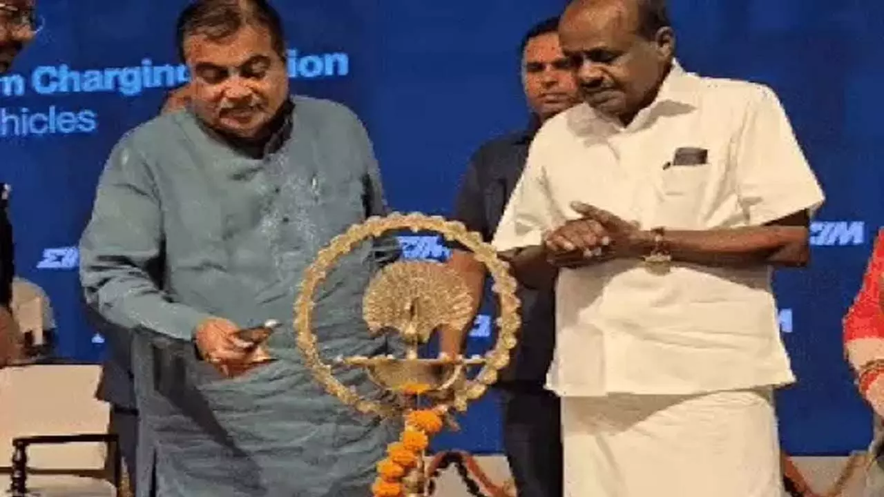 गन्नौर के DICT में दीप प्रज्ज्वलित करते केद्रीय मंत्री नितिन गडकरी और एचडी कुमार स्वामी।