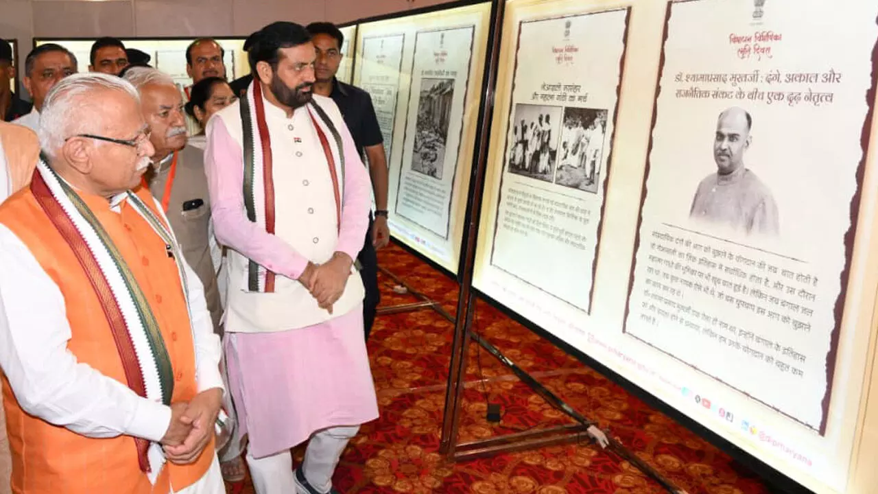 फरीदाबाद में विभाजन विभीषिका स्मृति दिवस पर प्रदर्शनी का अवलोकन करते केंद्रीय मंत्री मनोहर लाल व सीएम नायब सिंह सैनी।