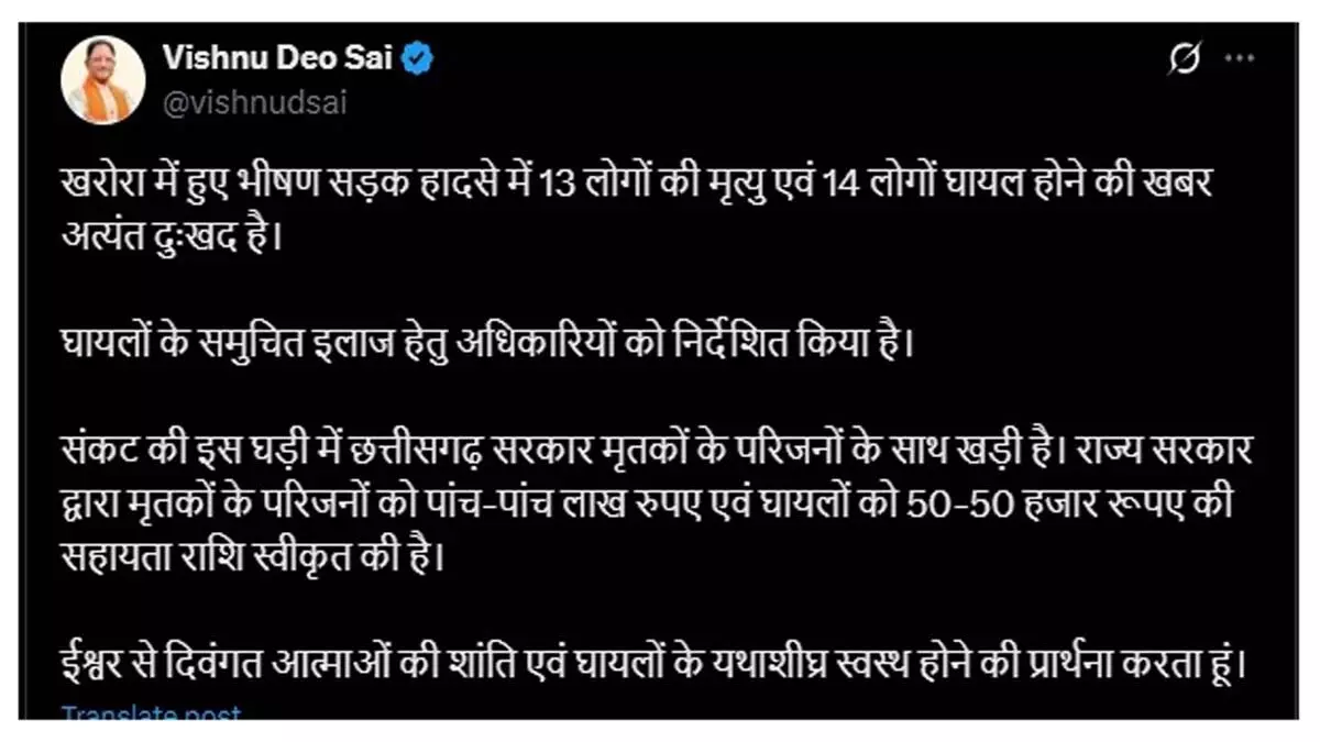 मुख्यमंत्री साय ने कहा कि, खरोरा में हुए भीषण सड़क हादसे की खबर अत्यंत पीड़ादायक है। मैं दिवंगत आत्माओं की शांति और घायलों के शीघ्र स्वस्थ होने की ईश्वर से प्रार्थना करता हूं। मुख्यमंत्री साय ने कहा कि, संकट की इस घड़ी में राज्य सरकार पीड़ित परिवारों के साथ पूरी संवेदनशीलता के साथ खड़ी है।