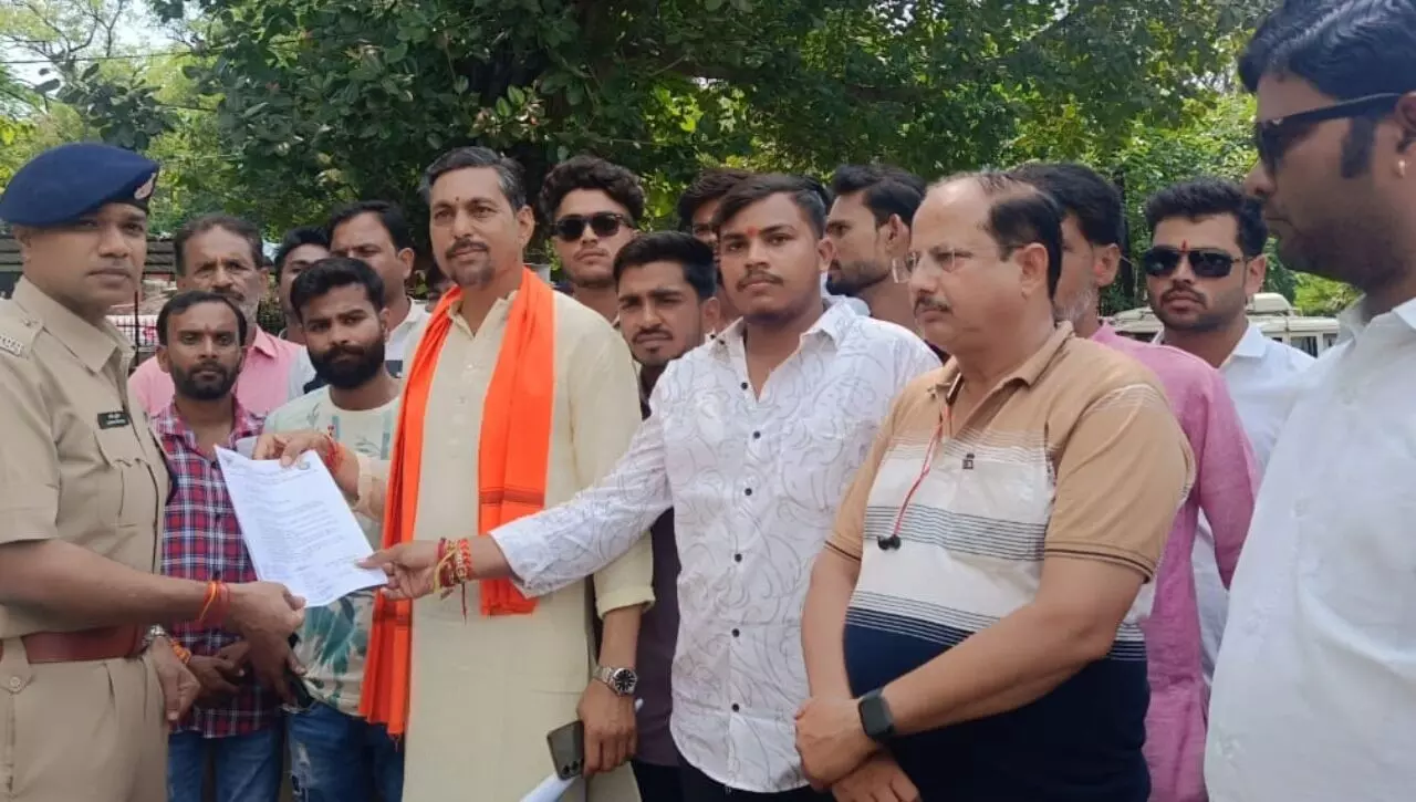 नरसिंहपुर में एसपी मीना को ज्ञापन देते VHP और बजरंग दल कार्यकर्ता।