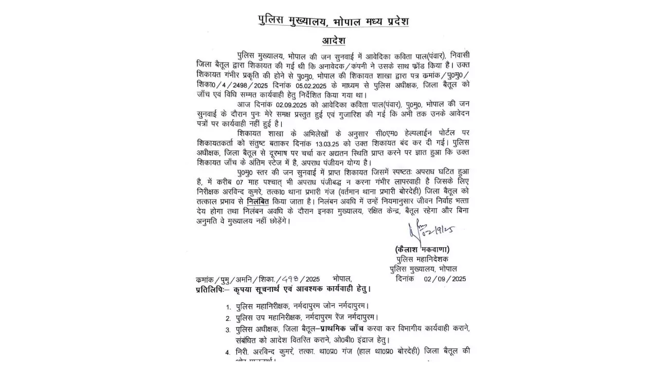 मामला उस समय सामने आया जब बैतूल की रहने वाली कविता पाल ने पुलिस मुख्यालय भोपाल में शिकायत दर्ज कराई कि एक कंपनी ने उनके साथ धोखाधड़ी की है। जांच में पता चला कि यह शिकायत 5 फरवरी 2025 को पुलिस अधीक्षक (SP) बैतूल के पास भेजी गई थी। SP ने मामले की गंभीरता को देखते हुए एफआईआर दर्ज करने का आदेश दिया था, लेकिन इसके बावजूद 7 महीने तक कोई कार्रवाई नहीं हुई।