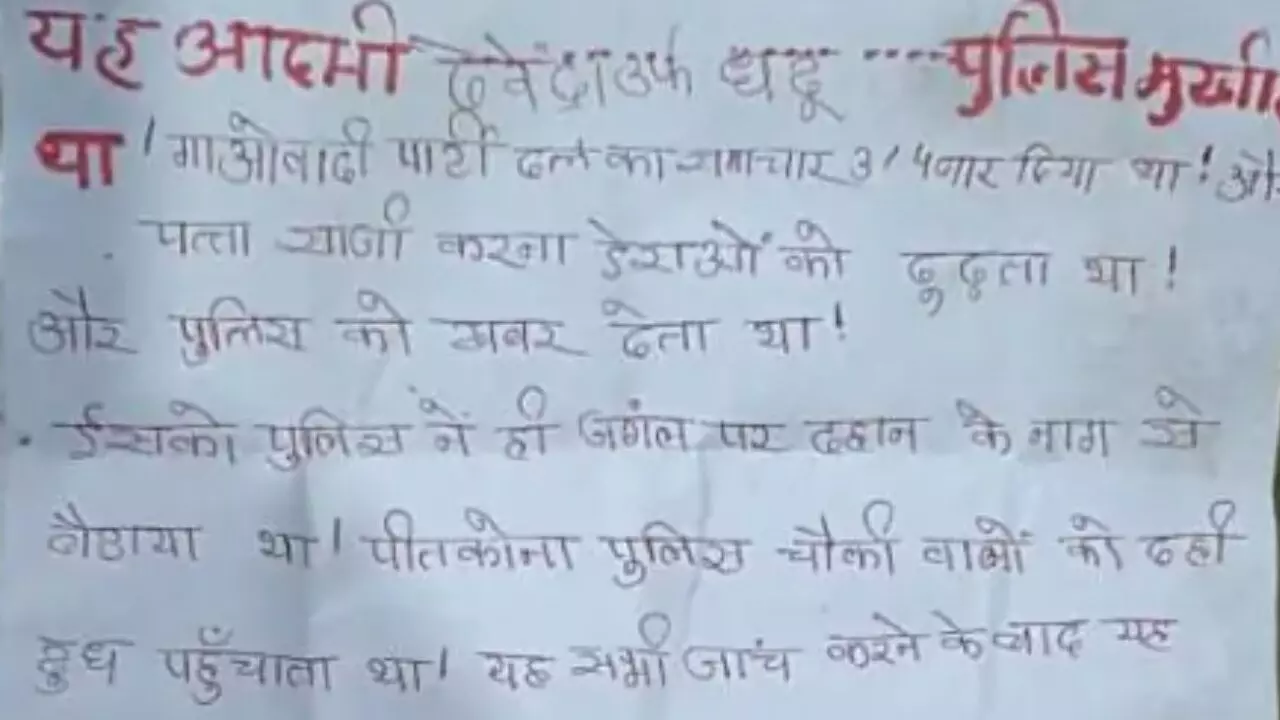 नक्सलियों ने पहले पर्चे में देवेंद्र को पुलिस का मुखबिर बताया है। पत्र के अनुसार, देवेंद्र ने कई बार माओवादी गतिविधियों की सूचना पुलिस को दी है। उसे 'दहान' नाम से जंगल में बैठाया गया था। पितकोना चौकी तक वह पुलिस के लिए दूध-दही लेकर जाता था। इन सब कारणों के चलते उसे मौत की सजा दी गई।