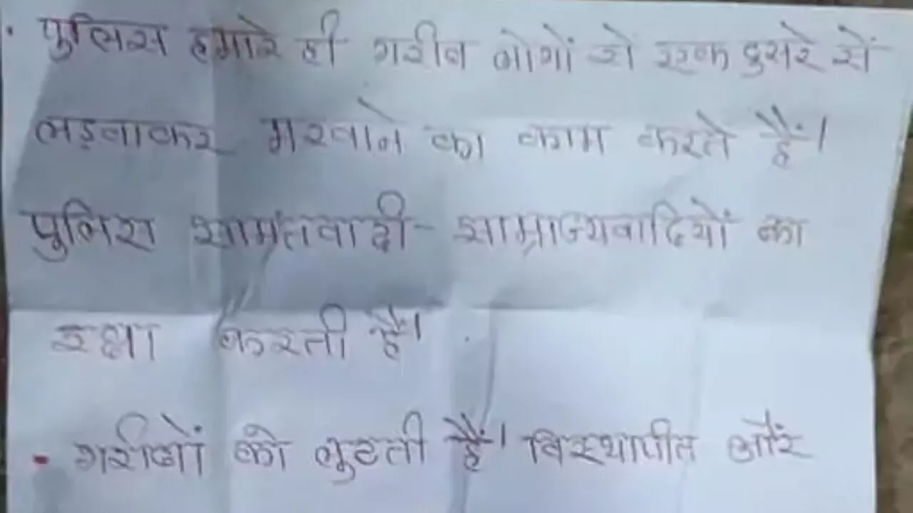 नक्सलियों ने दूसरे पर्चे में पुलिस को साम्राज्यवादी ताकतों का रक्षक बताया है। उसमें लिखा है कि पुलिस गरीबों को आपस में लड़वाकर मरवाती है। विस्थापन और लूट का माध्यम बनती है। लोगों को पुलिस से दूरी बनाकर रखने की चेतावनी दी है। कहा, पुलिस मुखबिरों को गांव में ही सुधारें, वरना परिणाम गंभीर हो सकते हैं।