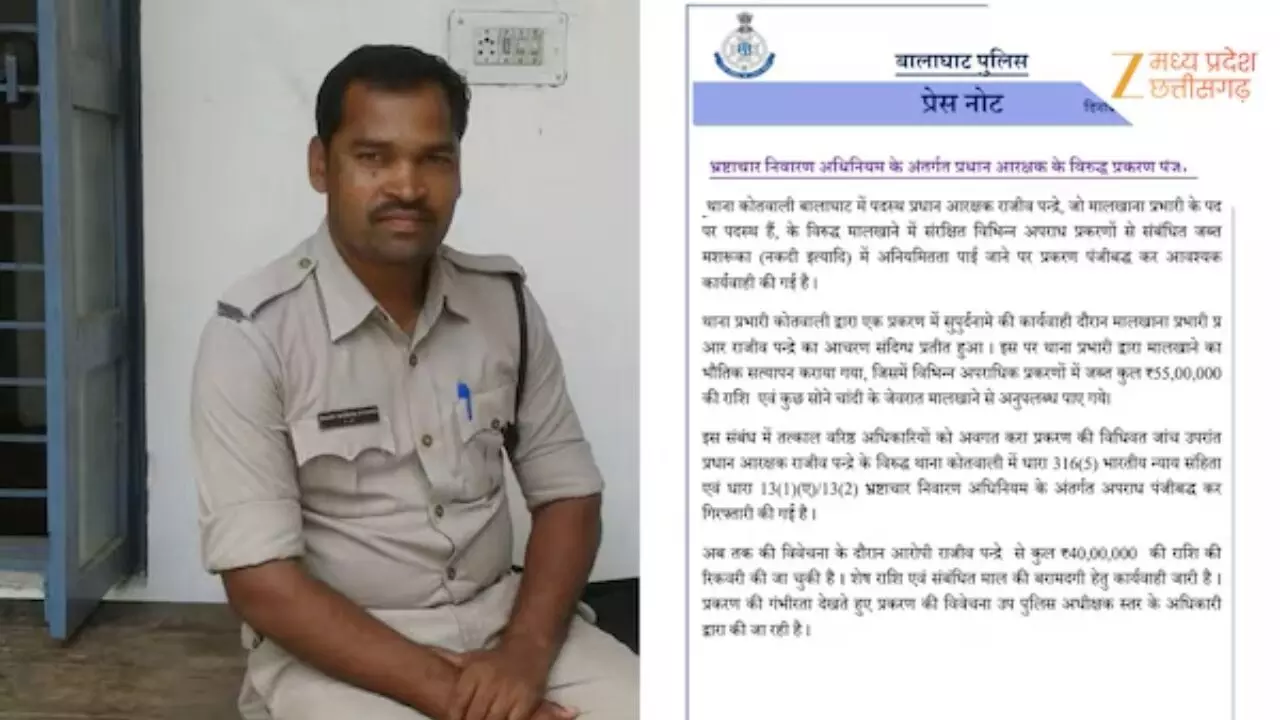 मध्यप्रदेश के बालाघाट जिले से एक हैरान करने वाला मामला सामने आया है। कोतवाली थाने के मालखाने से 55 लाख रुपए नकद और 10 लाख रुपए के गहने गायब हो गए। पुलिस जांच में चौंकाने वाला खुलासा हुआ कि यह रकम थाने के प्रधान आरक्षक और मालखाना इंचार्ज राजीव पंद्रे ने खुद ही गायब की थी।