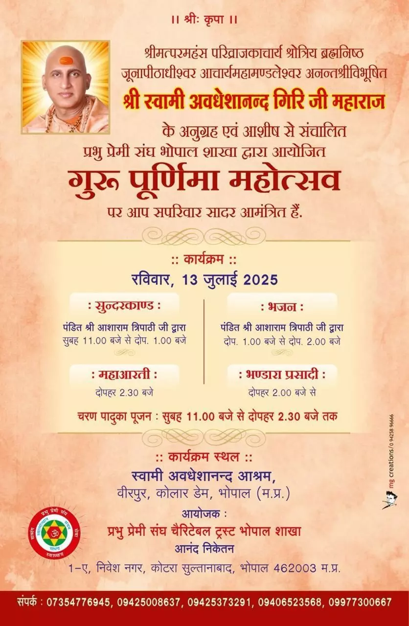 गुरु पूर्णिमा 2025: 13 जुलाई को स्वामी अवधेशानंद आश्रम- कोलार डेम भोपाल में भव्य महोत्सव; जानिए पूरी जानकारी