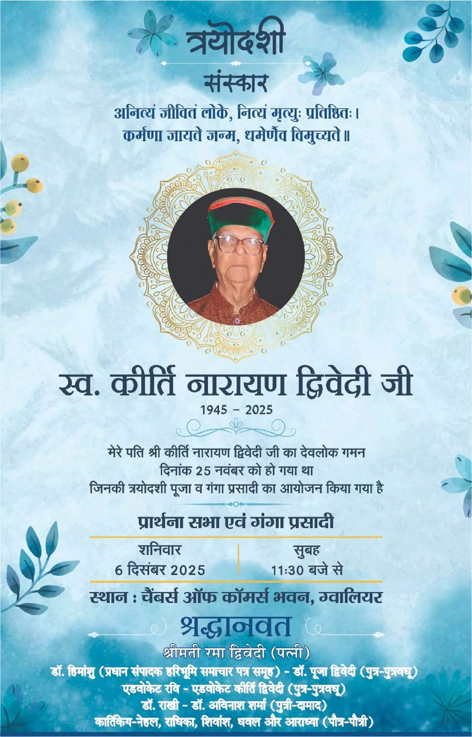 गौरतलब है कि स्व. कीर्ति नारायण द्विवेदी का 25 नवंबर को 80 वर्ष से अधिक आयु में निधन हो गया था। उसके बाद से हर रोज ग्वालियर स्थित निवास पर शोक संवेदना व्यक्त करने आने वाले लोगों का तांता लगा हुआ है। स्व. कीर्ति नारायण द्विवेदी अपने पीछे धर्मपत्नी, दो पुत्रों समेत भरा-पूरा परिवार छोड़ गए हैं।