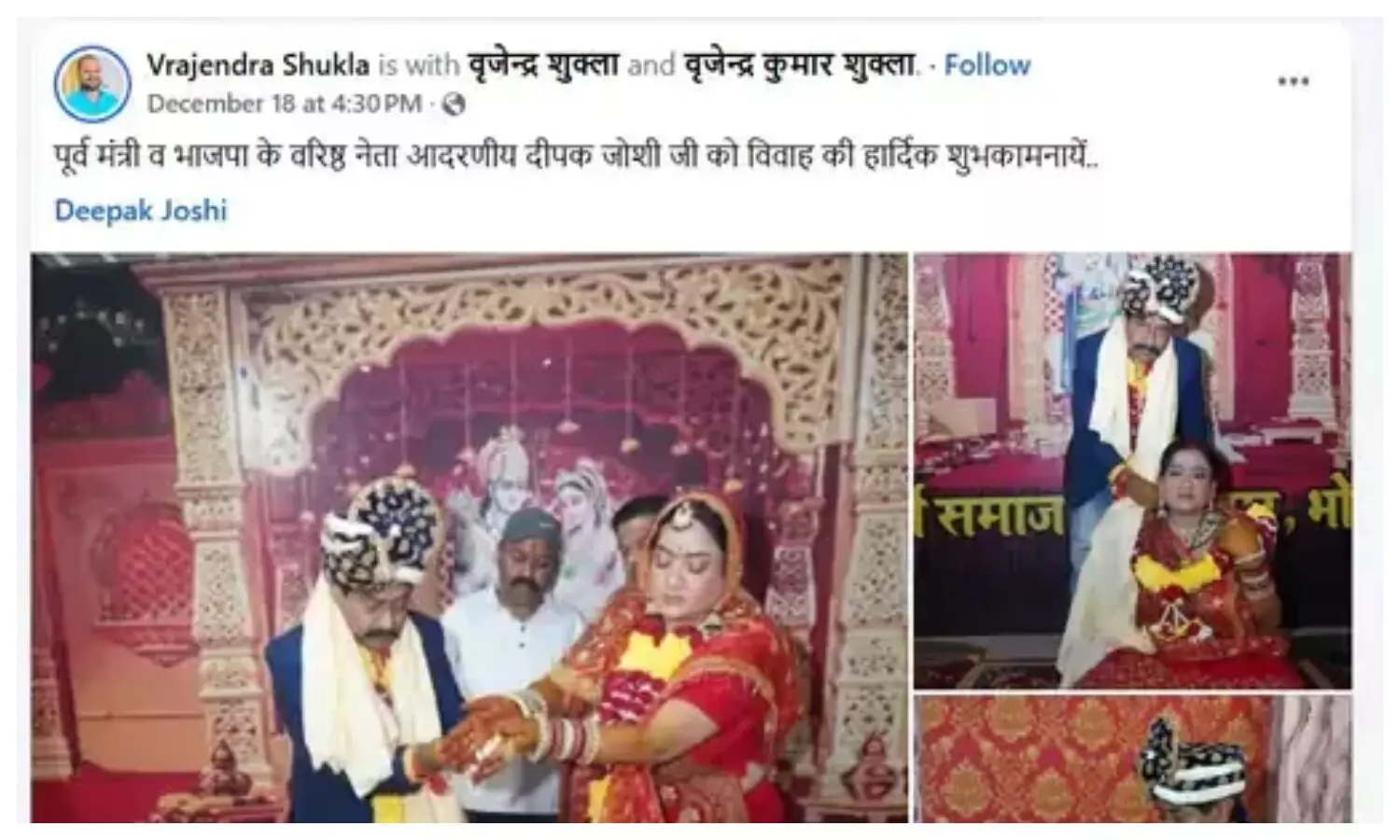 सोशल मीडिया पर सामने आई तस्वीरों में दीपक जोशी, पल्लवी राज सक्सेना की मांग में सिंदूर भरते नजर आ रहे हैं। हालांकि इन तस्वीरों की आधिकारिक पुष्टि नहीं हो सकी है। सूत्रों के अनुसार, यह विवाह 4 दिसंबर को आर्य समाज मंदिर में सादे समारोह के साथ संपन्न हुआ। बताया जा रहा है कि शादी की तस्वीरें सबसे पहले पल्लवी राज सक्सेना ने अपने सोशल मीडिया अकाउंट पर साझा की थीं, जिन्हें बाद में हटा लिया गया।