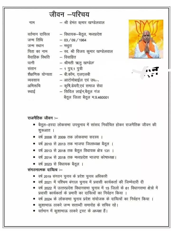 - विधायक (बैतूल): हेमंत खंडेलवाल वर्तमान में बैतूल विधानसभा सीट से बीजेपी के विधायक हैं। वे दो बार विधायक रह चुके हैं और क्षेत्र में उनकी मजबूत पकड़ मानी जाती है।