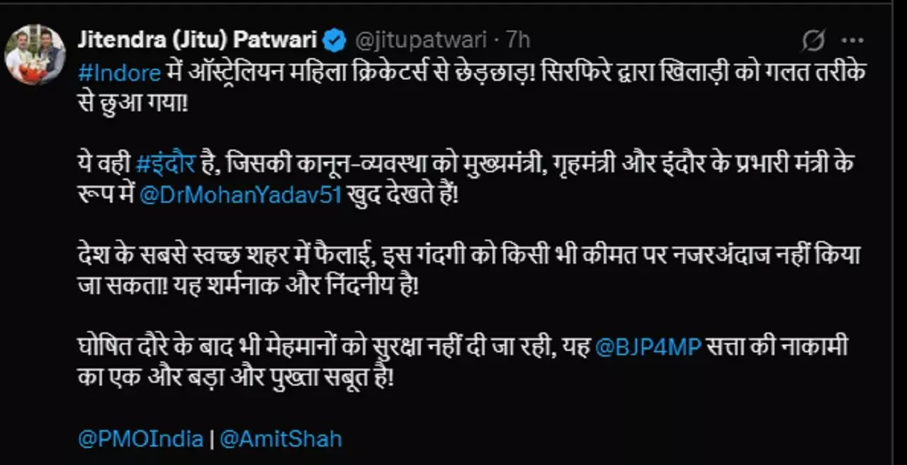 इंदौरः ऑस्ट्रेलियाई महिला क्रिकेट टीम की दो खिलाड़ियों से हुई छेड़छाड़ की घटना ने मध्य प्रदेश की राजनीति को गरमा दिया है। विपक्षी दल कांग्रेस और शिवसेना (यूबीटी) ने मुख्यमंत्री मोहन यादव पर सीधा निशाना साधते हुए कहा कि राज्य में कानून-व्यवस्था पूरी तरह चरमरा गई है। वहीं, सत्तारूढ़ भाजपा ने पुलिस की त्वरित कार्रवाई का बचाव करते हुए कहा कि आरोपी गिरफ्तार हो चुका है और सख्त सजा दी जाएगी।