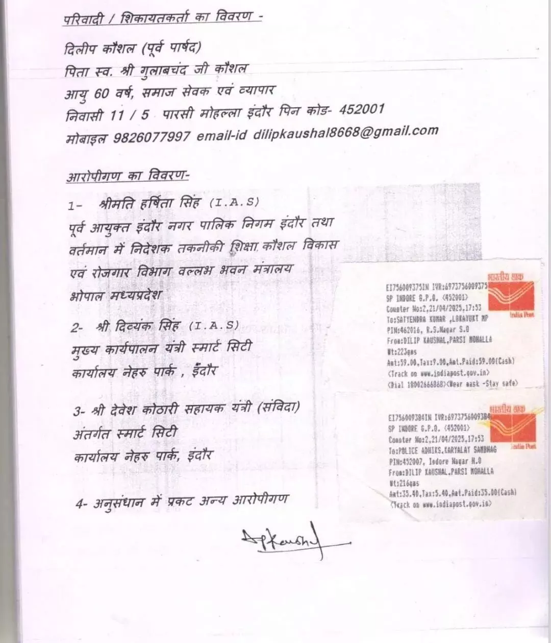 कौशल का दावा है कि उन्होंने निगमायुक्त हर्षिका सिंह और स्मार्ट सिटी CEO दिव्यांक सिंह को पूरे मामले की जानकारी दी थी, लेकिन दोनों अधिकारियों ने चुप्पी साधे रखी और कोई कार्रवाई नहीं की। इस पर उन्होंने भारतीय न्याय संहिता (BNS) 2023 की विभिन्न धाराओं के तहत शिकायत दर्ज की, जिसके बाद लोकायुक्त ने मामला क्रमांक 31/ई/2025 के तहत जांच में लिया है।