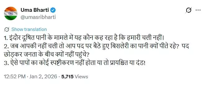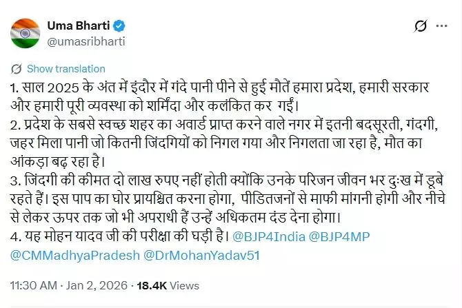 इंदौर में गंदे पानी से हुई मौतों को लेकर उमा भारती ने सोशल मीडिया प्लेटफॉर्म एक्स पर प्रतिक्रिया देते हुए इसे प्रदेश की व्यवस्था पर कलंक करार दिया। उन्होंने कहा कि वर्ष 2025 के अंत में इस तरह की घटनाएं न सिर्फ शर्मनाक हैं, बल्कि यह दर्शाती हैं कि व्यवस्था किस हद तक विफल रही है।