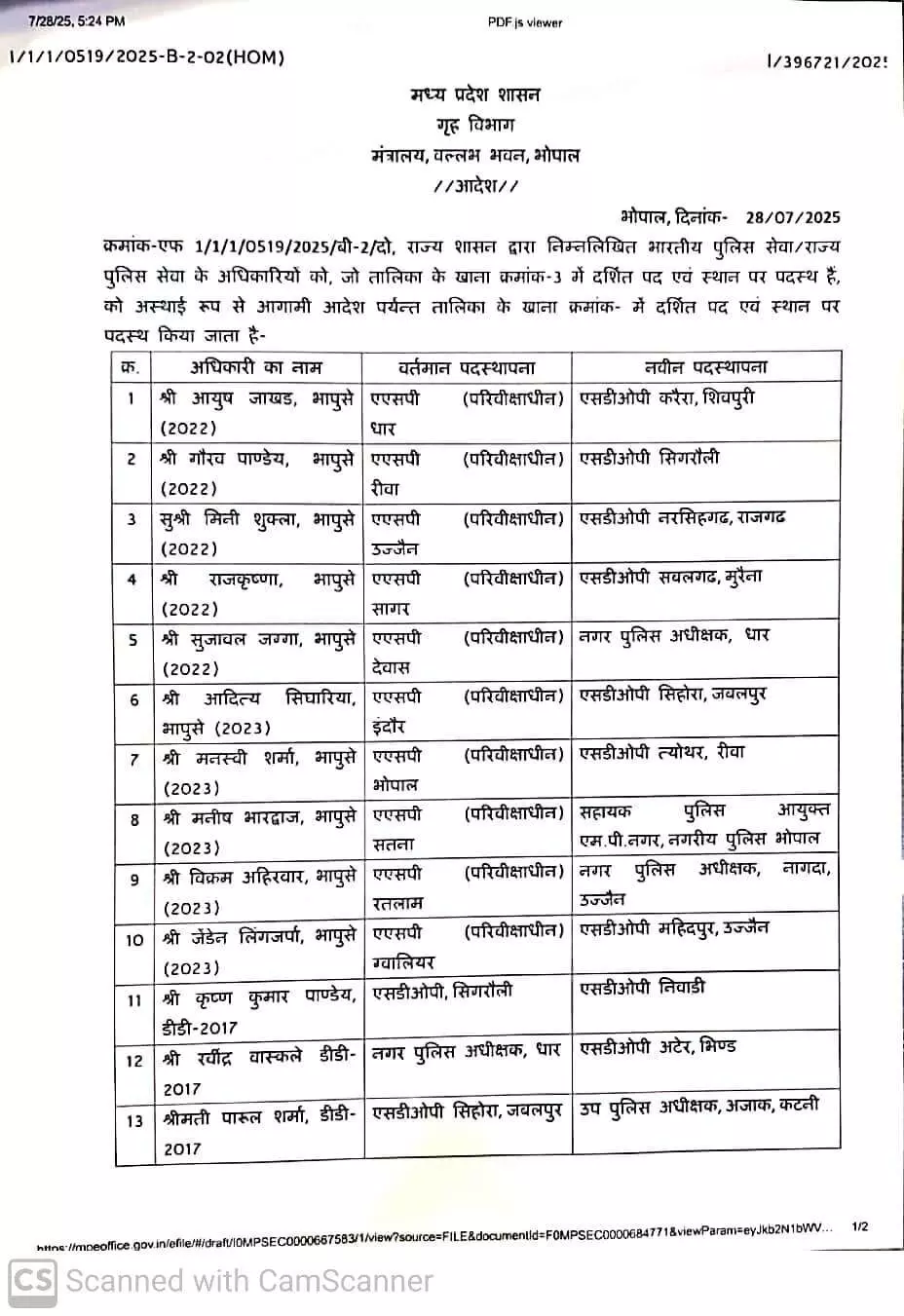 mp ips transfer: मध्यप्रदेश शासन ने मंगलवार (29 जुलाई) को 13 आईपीएस अधिकारियों के तबादले के आदेश जारी किए हैं। इस फेरबदल के तहत आईपीएस आशीष भारद्वाज को भोपाल के एमपी नगर क्षेत्र में नई पोस्टिंग मिली है। शासन के आदेश के अनुसार, ये सभी तबादले तत्काल प्रभाव से लागू माने जाएंगे।