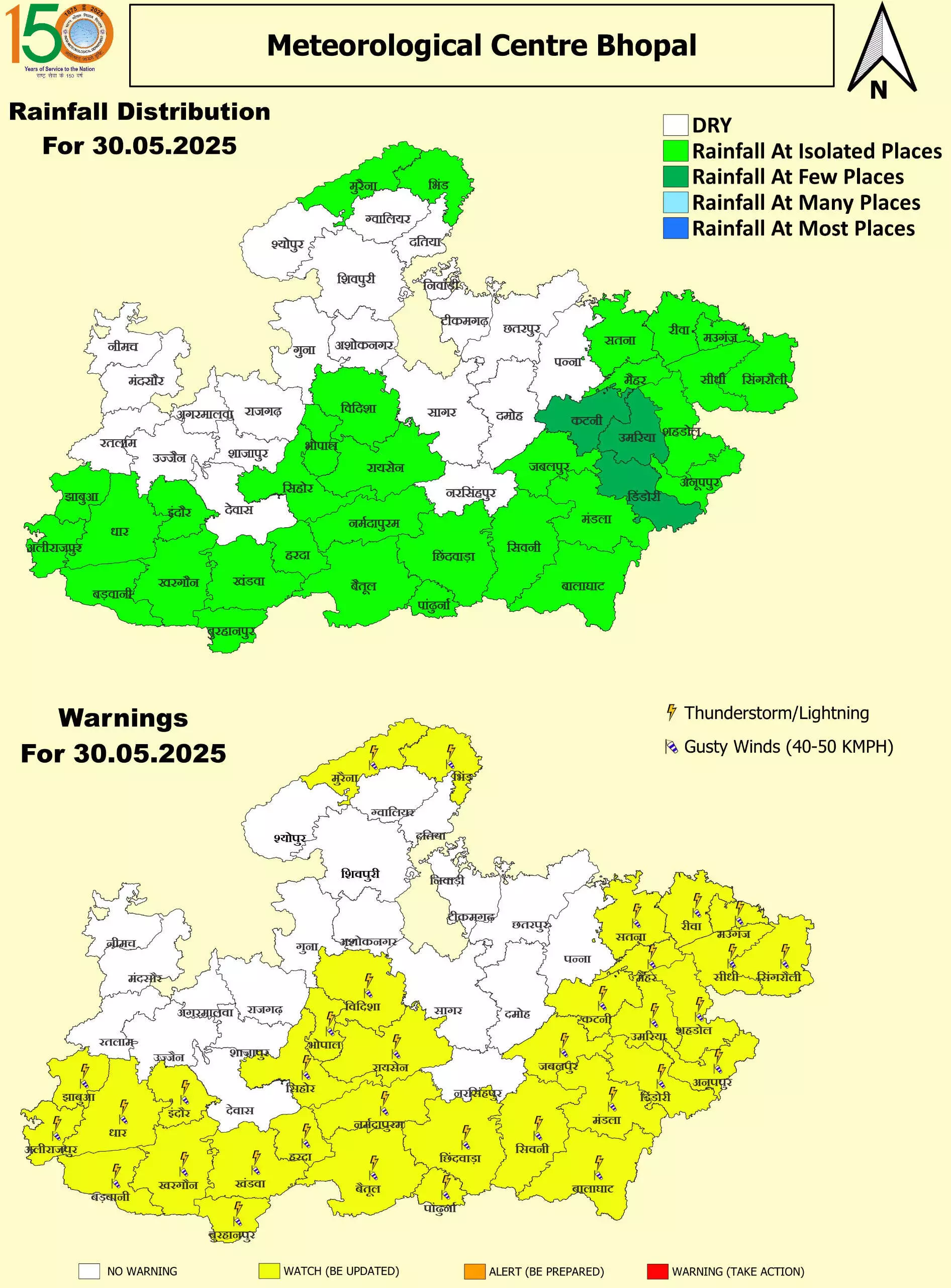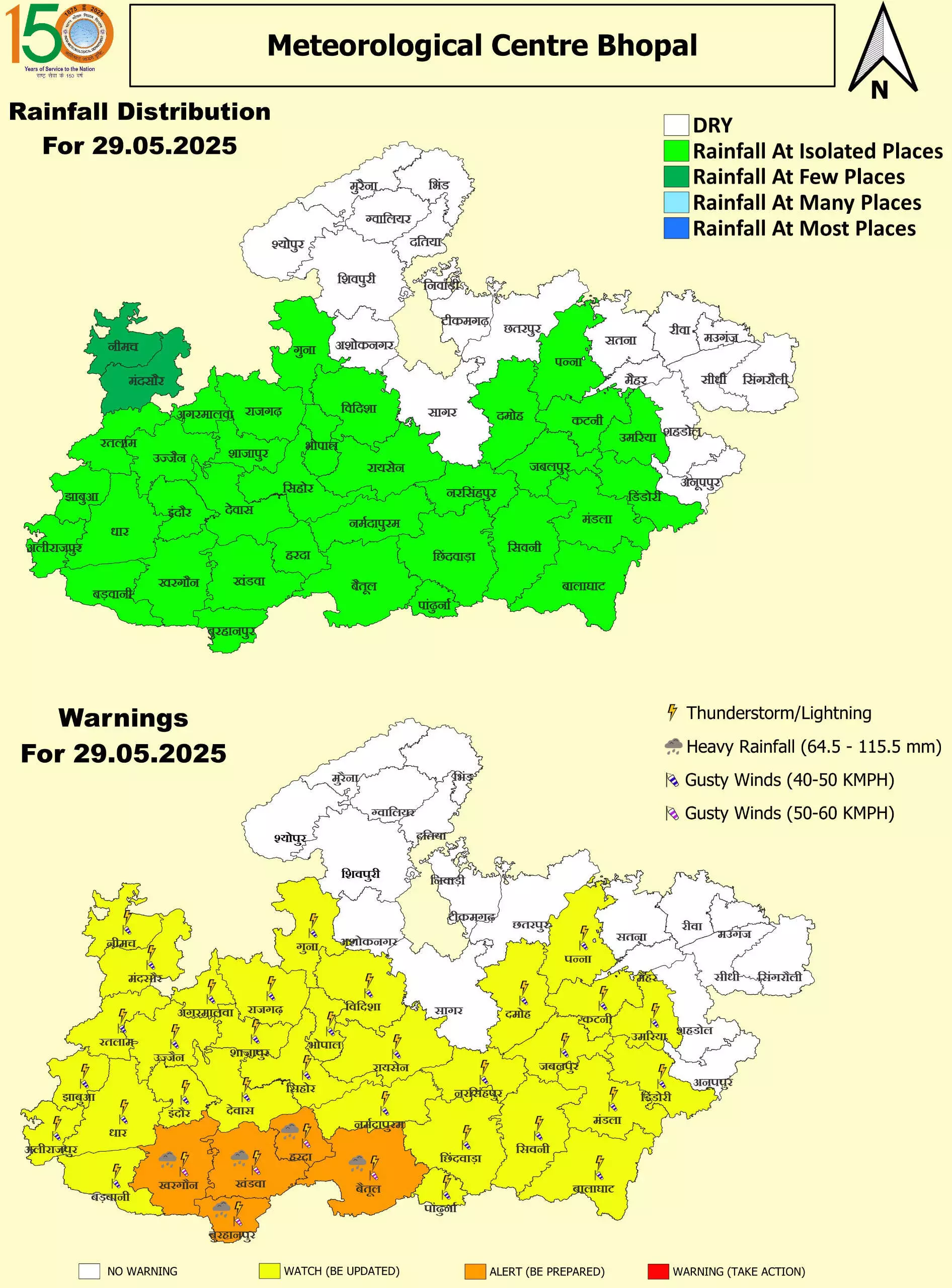 मौसम विभाग ने गुरुवार (29 मई) को भोपाल, इंदौर, नीमच, मंदसौर, गुना, पन्ना, राजगढ़, आगरमालवा, विदिशा, दमोह, कटनी, उमरिया, रतलाम, उज्जैन, शाजापुर, रायसेन, जबलपुर, सिहोर, अनूपपुर, नरसिंहपुर, झाबुआ, डिंडोरी, देवास, नर्मदापुरम, मंडला, धार, अलीराजपुर, सिवनी, हरदा, छिंदवाड़ा, खरगौन, खंडवा, बड़वानी, बैतूल, बालाघाट, पांढुर्ना और बुरहानपुर में आंधी-बारिश का अलर्ट जारी किया है। मुरैना, भिंड, ग्वालियर, श्योपुर, दतिया, शिवपुरी, निवाड़ी, टीकमगढ़, छतरपुर, अशोकनगर, सागर, सतना, रीवा, मैहर, सीधी, सिंगरौली, अनूपपुर, शहडोल और मऊगंज में मौसम साफ रहेगा।
