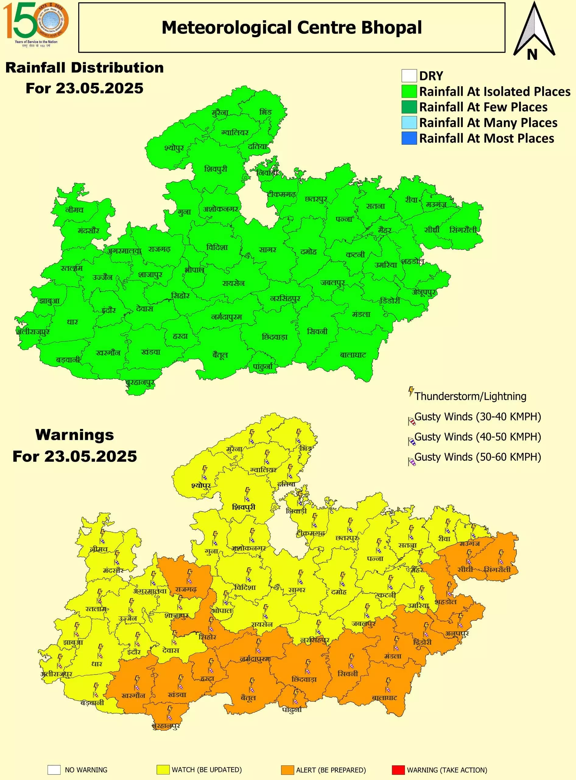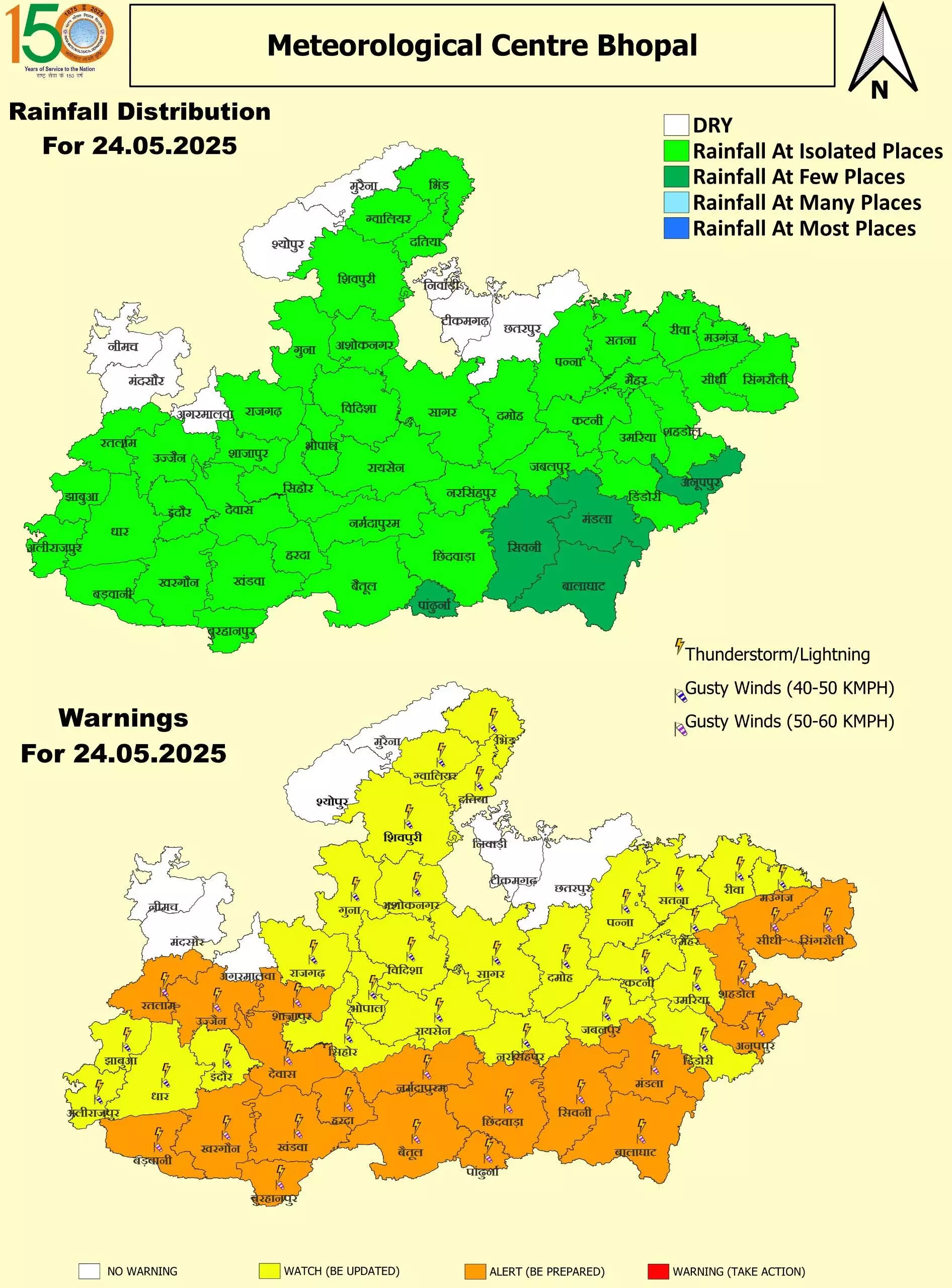 मौसम विभाग ने शनिवार (24 मई) को रीवा, सीधी, भोपाल, इंदौर, गुना, राजगढ़, आगर-मालवा, सतना, उज्जैन, ग्वालियर, मुरैना, भिंड, दतिया, निवाड़ी, टीकमगढ़, छतरपुर, सिंगरौली, पन्ना, दमोह, सागर, विदिशा, रायसेन, नर्मदापुरम, बैतूल, हरदा, सीहोर, शाजापुर, मंदसौर, श्योपुर, शिवपुरी, अशोकनगर, मऊगंज, नीमच देवास, खंडवा, बुरहानपुर, खरगोन, बड़वानी, धार, अलीराजपुर, झाबुआ और रतलाम में बारिश का अलर्ट जारी किया है। तेज हवा भी चलेगी। जबलपुर, मैहर कटनी, उमरिया, शहडोल, अनूपपुर, डिंडौरी, मंडला, बालाघाट, सिवनी, पांढुर्णा, छिंदवाड़ा, नरसिंहपुर में आंधी की रफ्तार 60 किमी प्रतिघंटा तक रह सकती है।