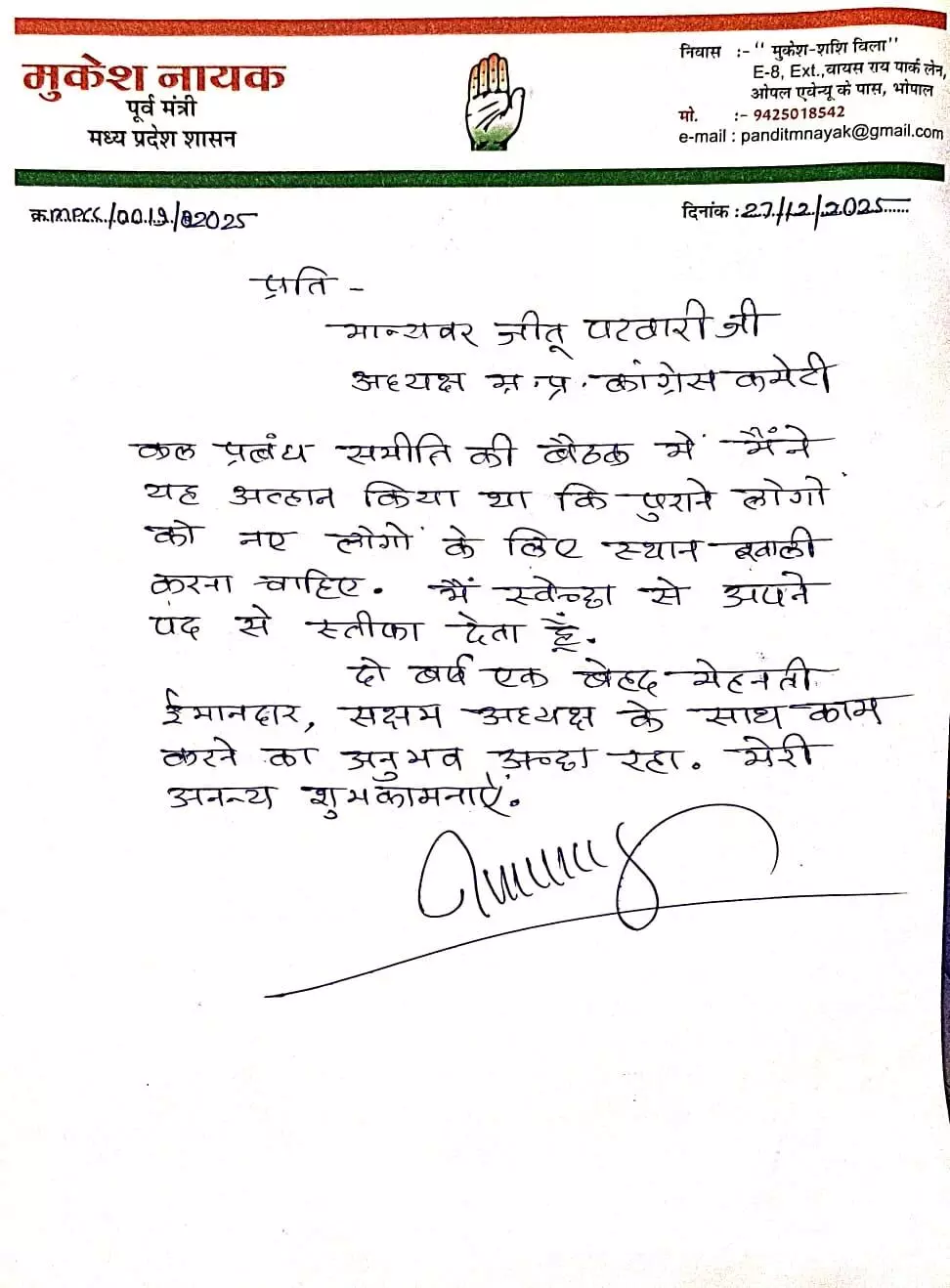 भोपाल। मध्यप्रदेश कांग्रेस में संगठनात्मक स्तर पर शनिवार को एक अहम घटनाक्रम सामने आया है। कांग्रेस मीडिया विभाग के अध्यक्ष और पूर्व मंत्री मुकेश नायक ने अपने पद से इस्तीफा दे दिया है। उन्होंने यह इस्तीफा कांग्रेस प्रदेश अध्यक्ष जीतू पटवारी को भेजा, जिसे प्रदेश कांग्रेस कमेटी ने अस्वीकार कर दिया है।