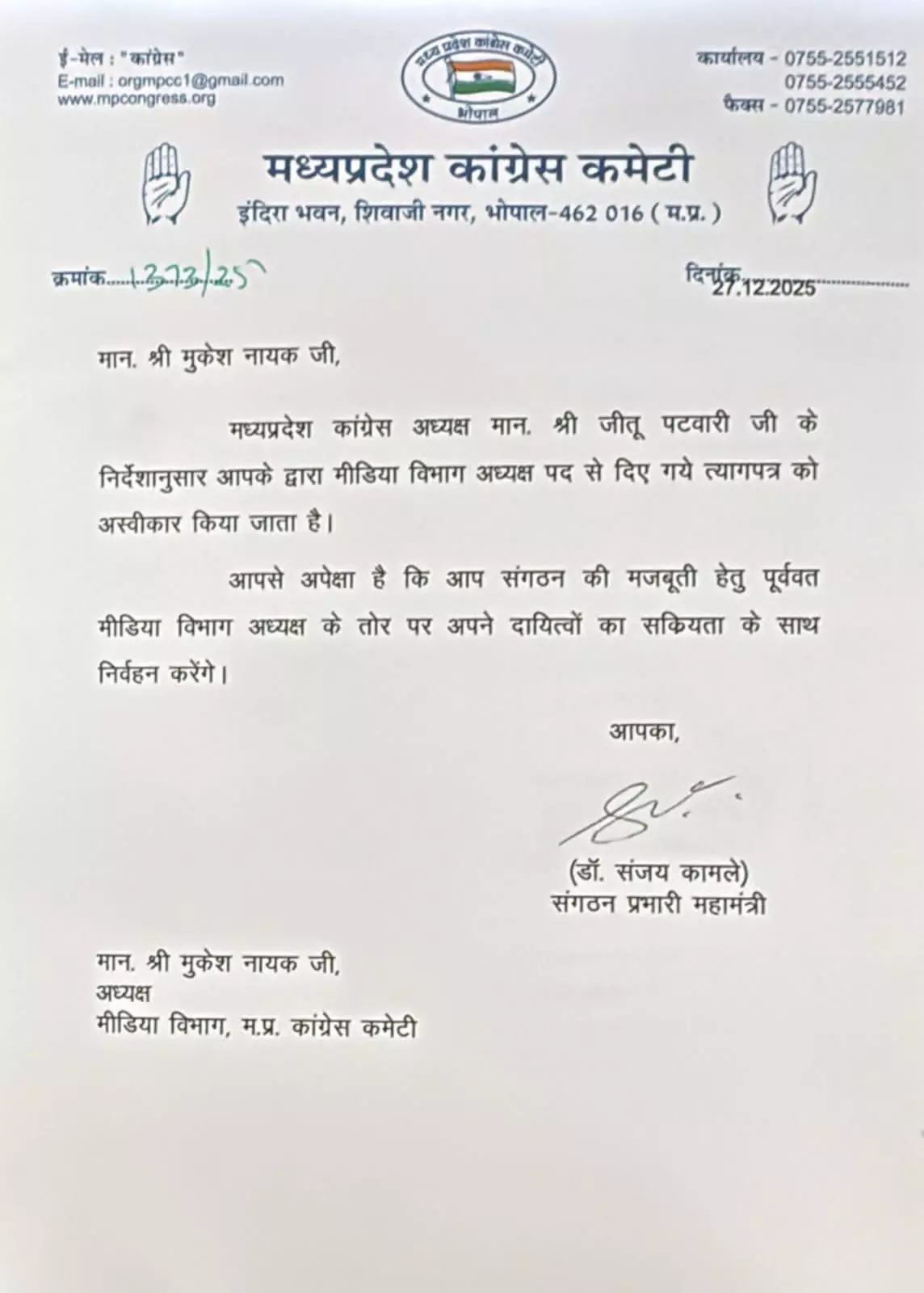 मध्यप्रदेश कांग्रेस कमेटी की ओर से जारी आधिकारिक पत्र में कहा गया है कि प्रदेश अध्यक्ष जीतू पटवारी के निर्देशानुसार मुकेश नायक द्वारा दिया गया इस्तीफा स्वीकार नहीं किया गया है और उनसे अपेक्षा की गई है कि वे पूर्ववत मीडिया विभाग अध्यक्ष के रूप में अपने दायित्व निभाते रहेंगे।