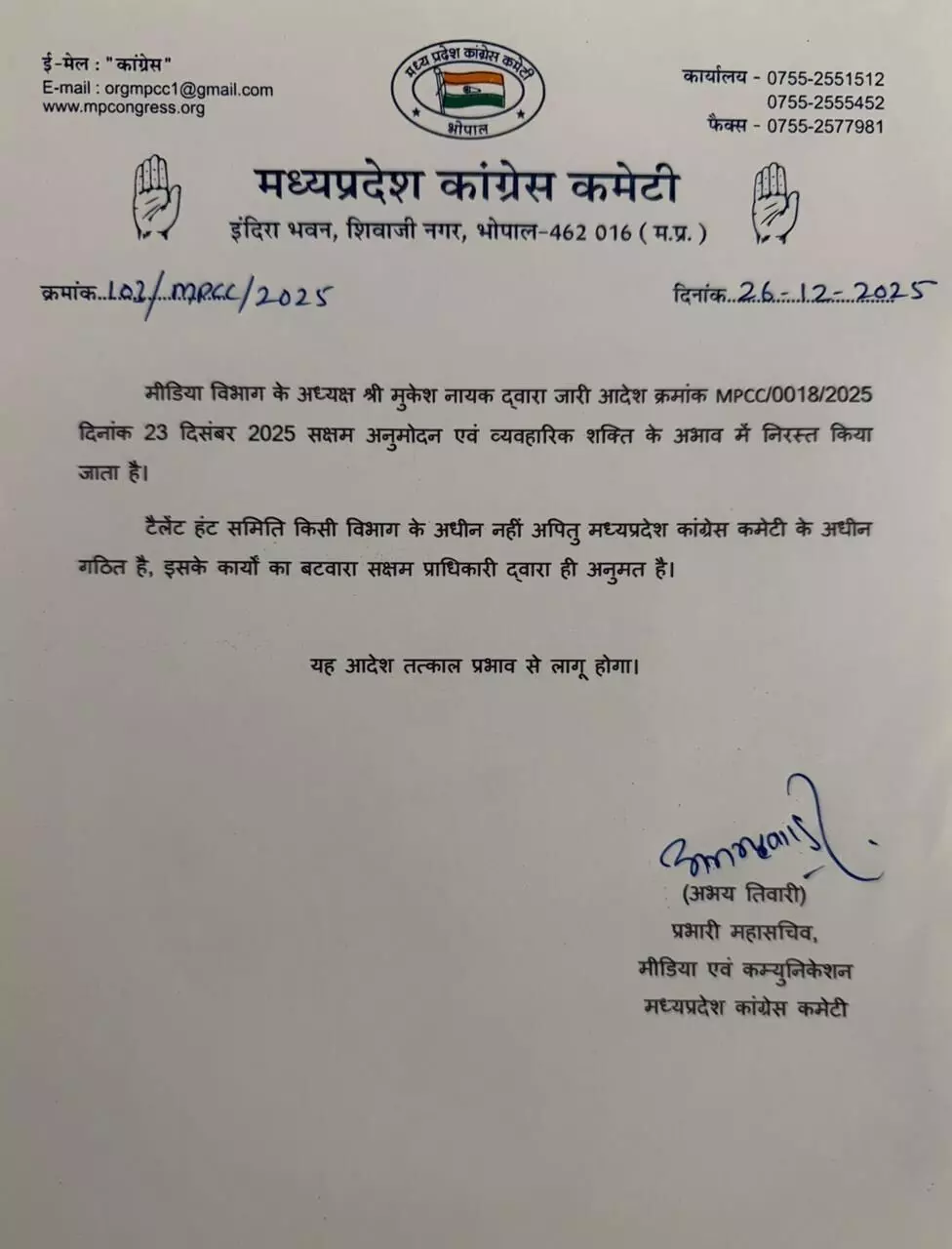 फिलहाल मुकेश नायक पद पर बने रहेंगे, लेकिन यह घटनाक्रम साफ संकेत देता है कि कांग्रेस में मीडिया और कम्युनिकेशन टीम को लेकर बड़े स्तर पर पुनर्गठन की तैयारी चल रही है।
