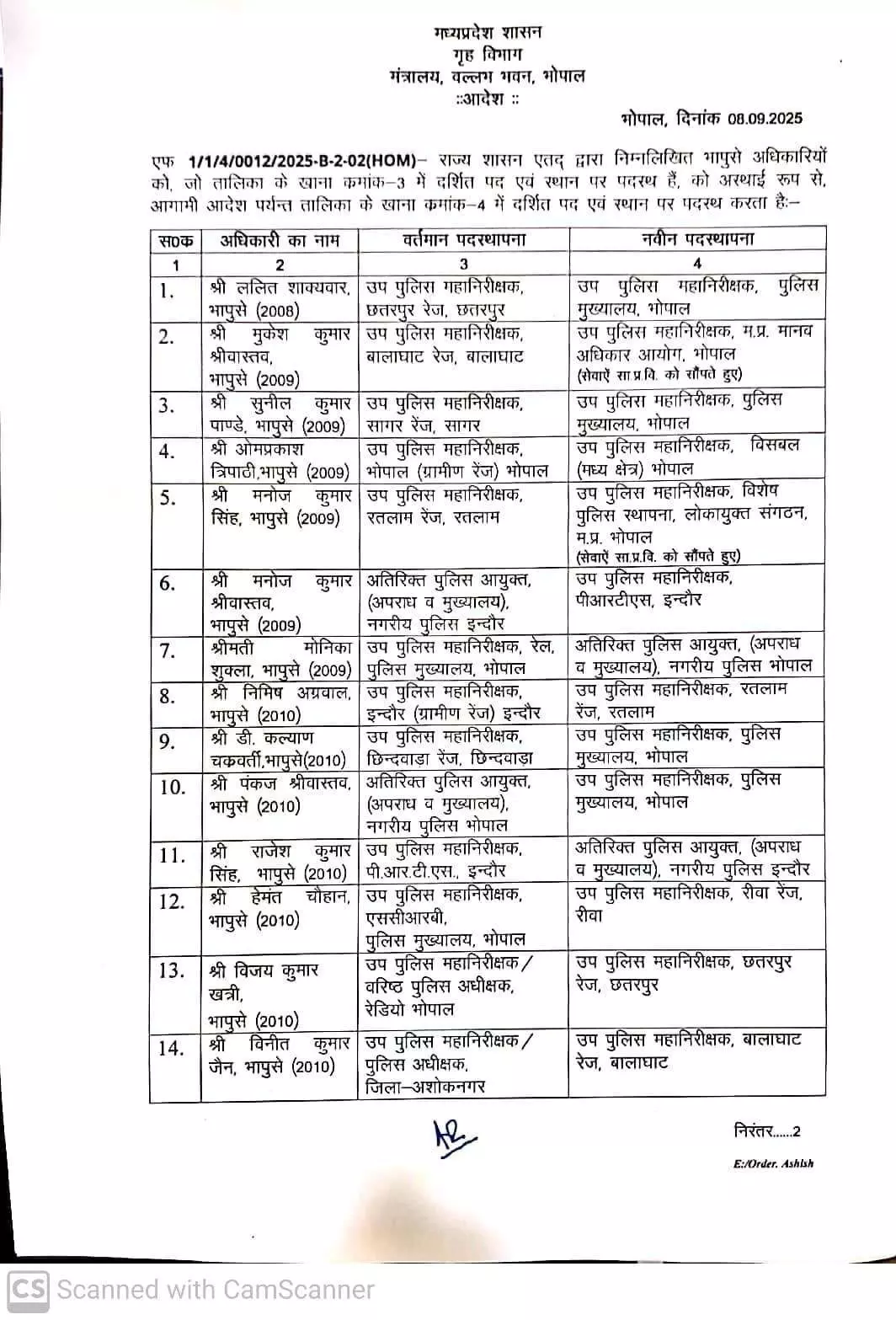 - ललित शाक्यवार (पूर्व डीआईजी छतरपुर) और सुनील कुमार पांडे (पूर्व डीआईजी सागर) को PHQ में स्थानांतरित किया गया।
