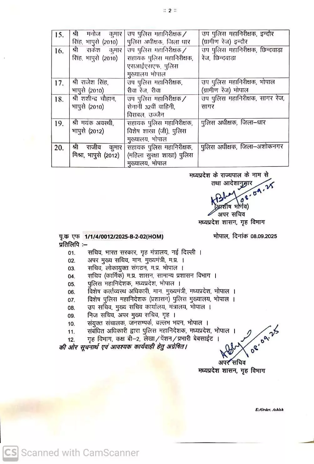 MP IPS Transfer List: मध्यप्रदेश सरकार ने 20 आईपीएस अधिकारियों के तबादले किए हैं, जिनमें अशोकनगर और धार के नए एसपी सहित कई डीआईजी स्तर के अधिकारी शामिल हैं। जानिए पूरी तबादला सूची।