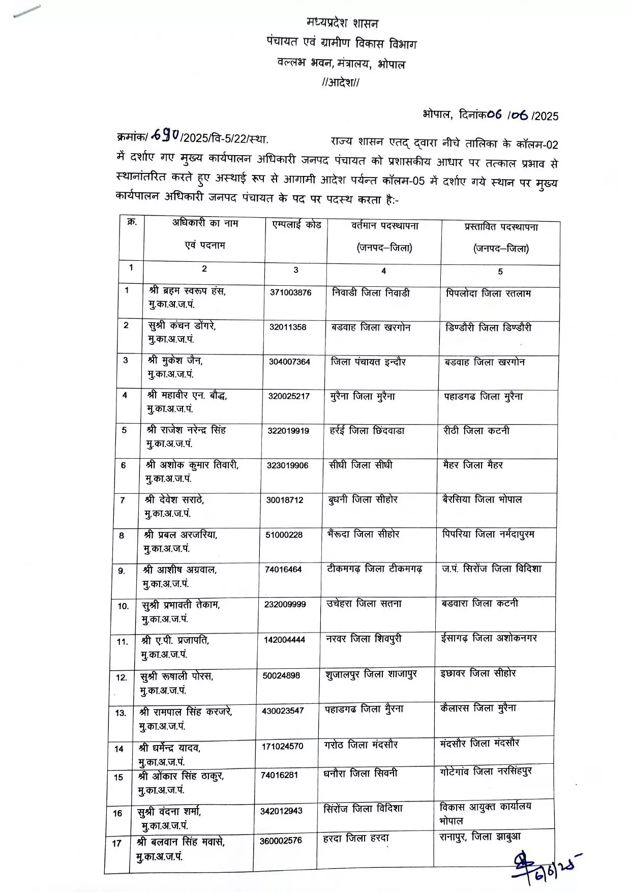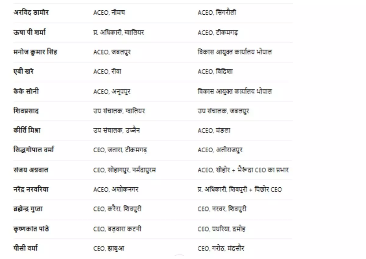 MP Transfer List: पंचायत विभाग में बड़ा फेरबदल, CEO-ACEO और BDO स्तर के 70 से अधिक अधिकारी बदले; देखें सची