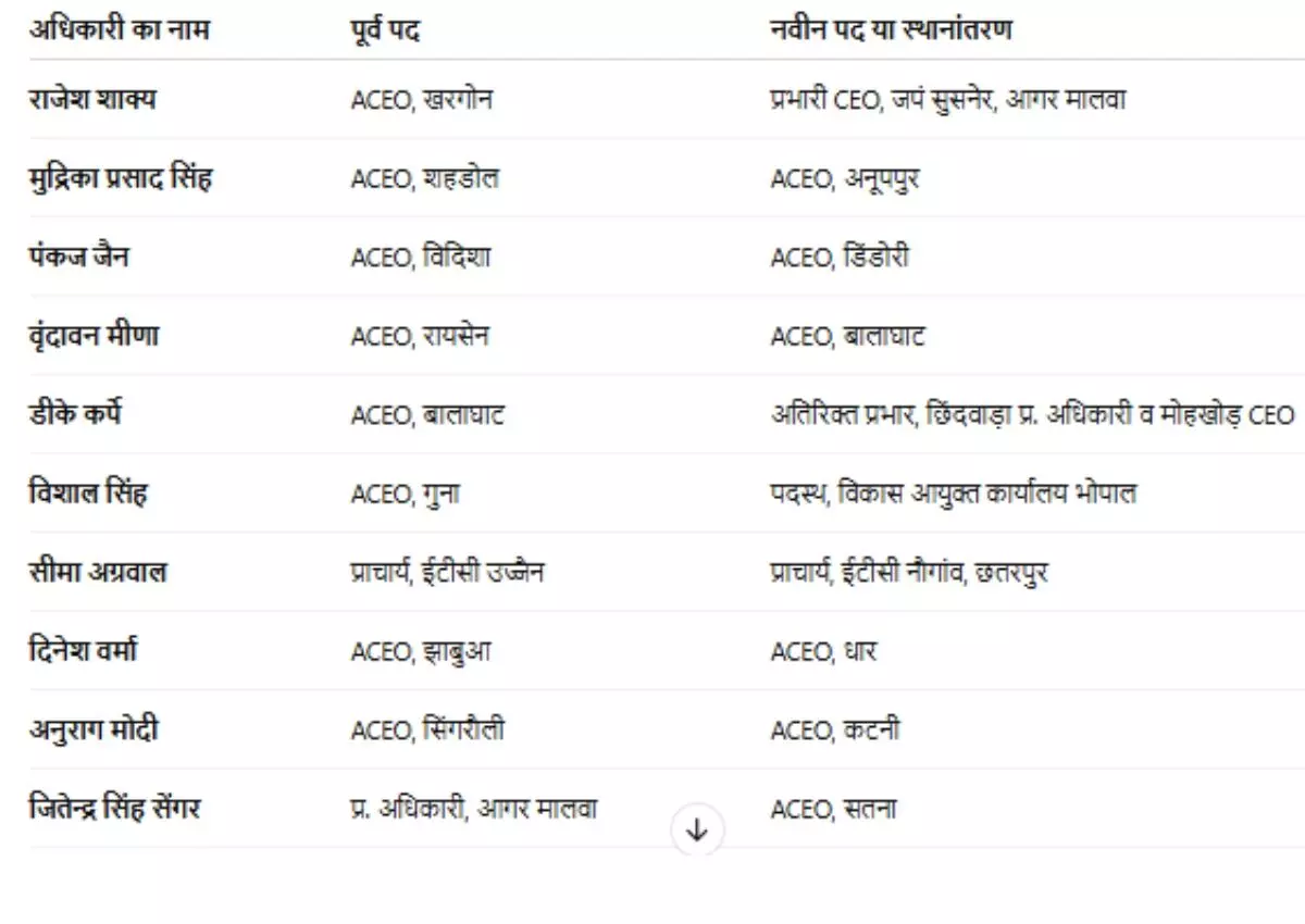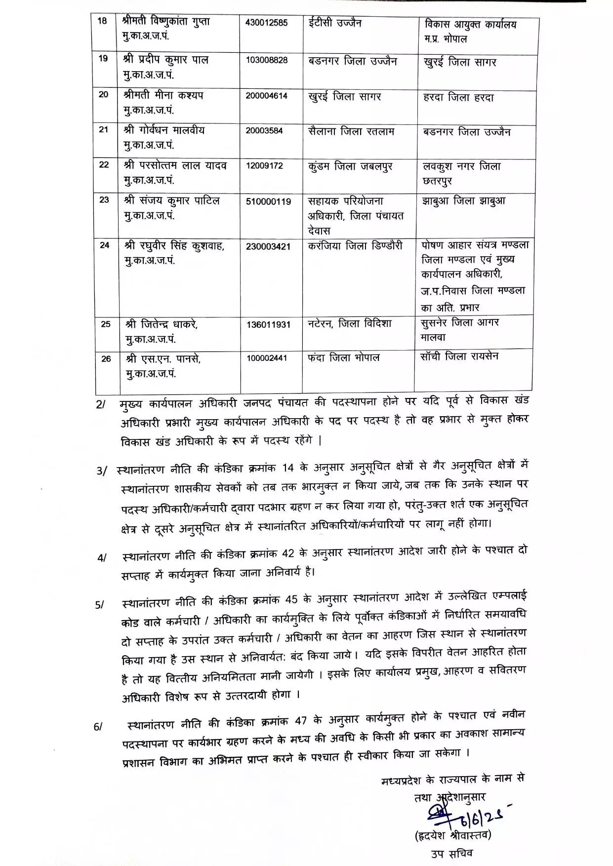 मध्य प्रदेश पंचायती राज विभाग ने 23 अतिरिक्त मुख्य कार्यपालन अधिकारियों (ACEO) और 23 ब्लॉक डेवलपमेंट ऑफिसरों (BDO) के भी तबादले किए हैं। कई अधिकारियों को प्रभारी जनपद पंचायत CEO का अतिरिक्त प्रभार सौंपा गया है।