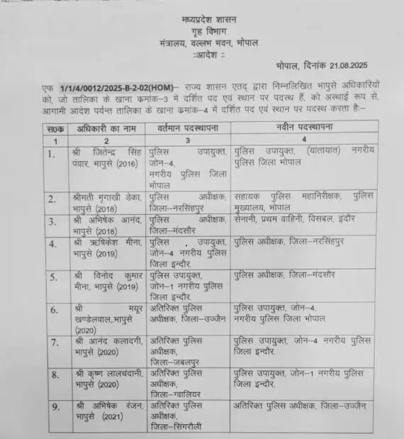 मध्य प्रदेश में गुरुवार (21 अगस्त) देर रात 9 IPS (भारतीय पुलिस सेवा) अफसरों के तबादले। नरसिंहपुर और मंदसौर के एसपी भी बदले। देखें पूरी लिस्ट