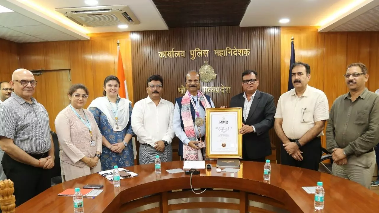 पुलिस मुख्यालय, भोपाल: वर्ल्ड बुक ऑफ रिकॉर्ड्स के सीईओ संतोष शुक्ला ने डीजीपी कैलाश मकवाणा और एडीजी नारकोटिक्स के.पी. व्यंकटेश्वर राव को 'नशे से दूरी-है जरूरी' अभियान के लिए वर्ल्ड रिकॉर्ड प्रमाण पत्र सौंपा।