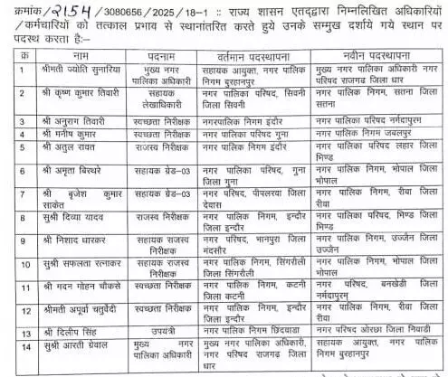 ट्रांसफर लिस्ट में एक दर्जन से अधिक नगर पालिकाओं के प्रमुख प्रशासनिक पदों पर पदस्थापना की गई है। यह तबादले राज्यभर के शहरी प्रशासन में प्रशासनिक गति और पारदर्शिता लाने के उद्देश्य से किए गए हैं।