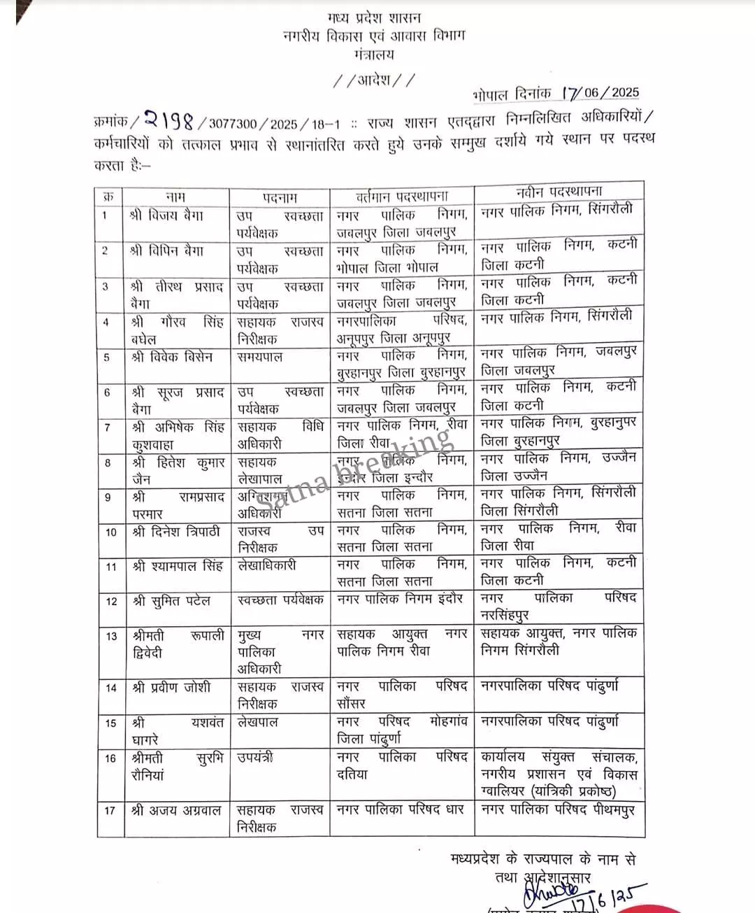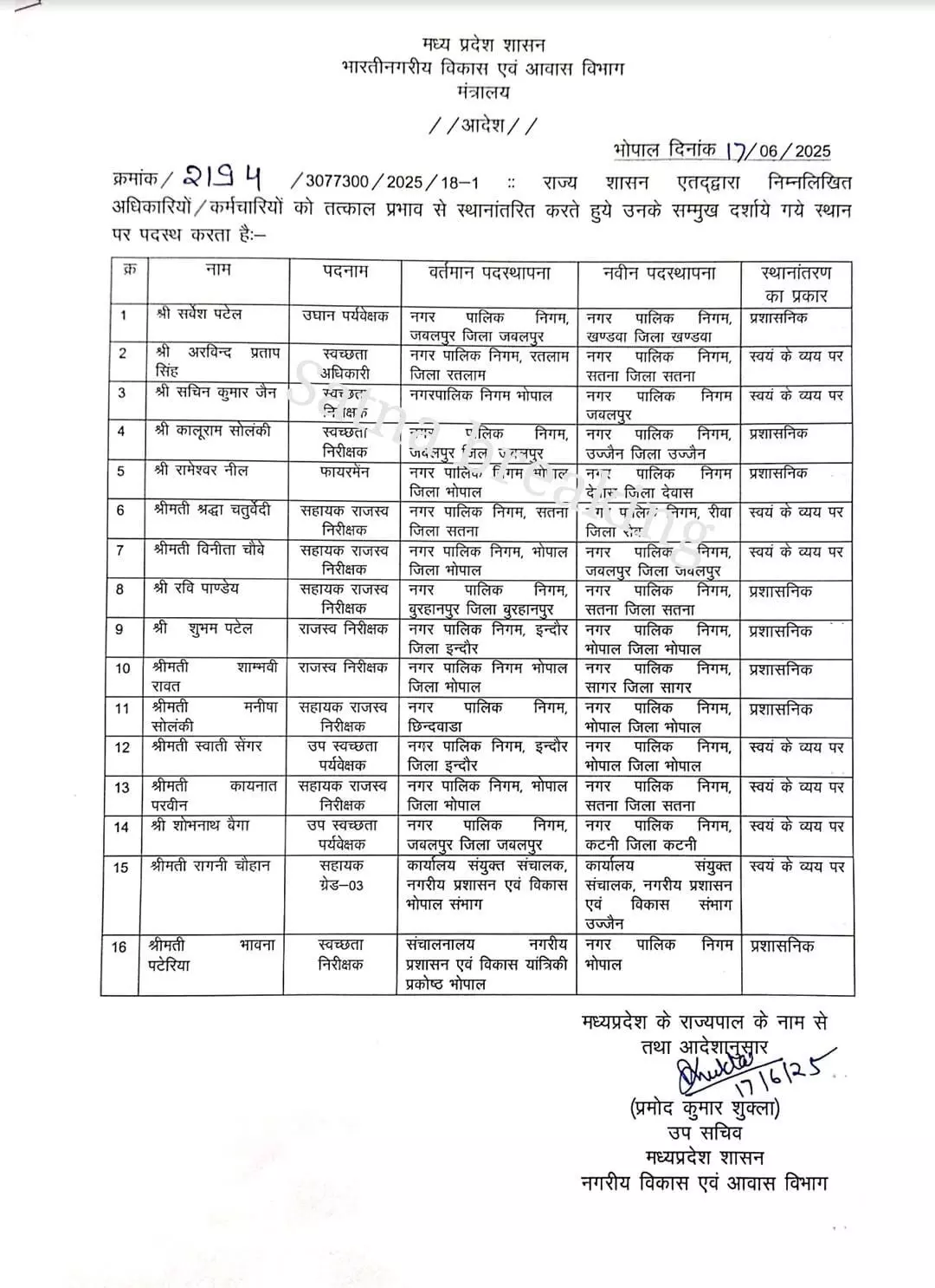 MP Transfer: नगरीय निकायों में बड़ी प्रशासनिक सर्जरी, CMO से भृत्य तक 68 अधिकारी-कर्मचारी बदले; देखें सूची
