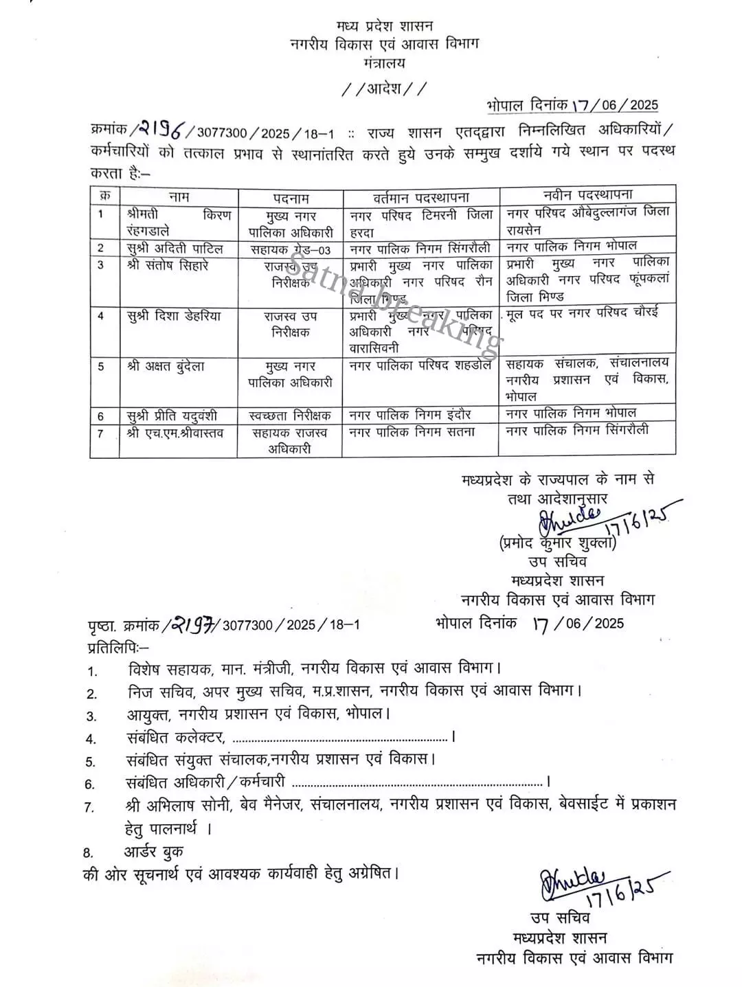 - किरण रंहगडाले सीएमओ, नगर परिषद टिमरनी हरदा से नगर परिषद औबेदुल्लागंज जिला रायसेन