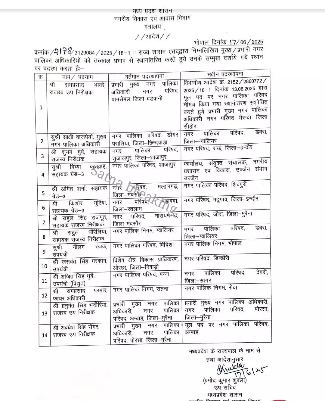 MP Transfer List: मध्य प्रदेश में नगरीय विकास एवं आवास विभाग द्वारा एक बार फिर व्यापक स्तर पर तबादले किए गए हैं। मंगलवार, 17 जून 2025 को विभाग द्वारा करीब 70 अधिकारियों और कर्मचारियों के तबादले का आदेश जारी किया गया। यह आदेश उप सचिव प्रमोद शुक्ला द्वारा जारी किया गया, जिसमें मुख्य नगर पालिका अधिकारियों (CMO) और प्रभारी अधिकारियों के नाम प्रमुखता से शामिल हैं।