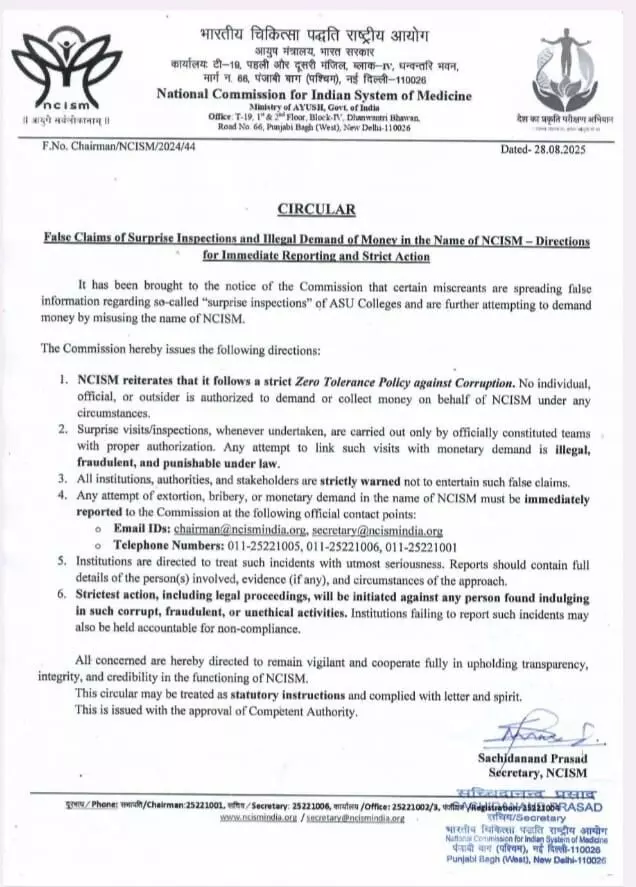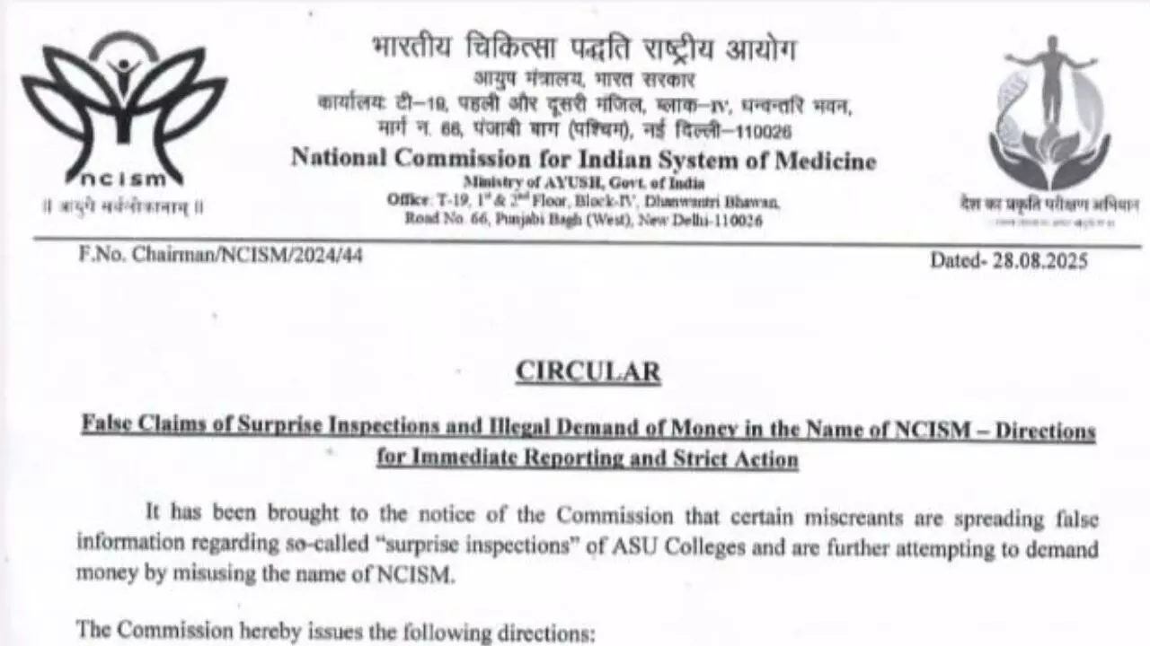 NCISM circular 2025: कॉलेजों में निरीक्षण के नाम पर अड़ीबाजी और वसूली बर्दाश्त नहीं, NCISM ने जारी किया सख्त नोटिस