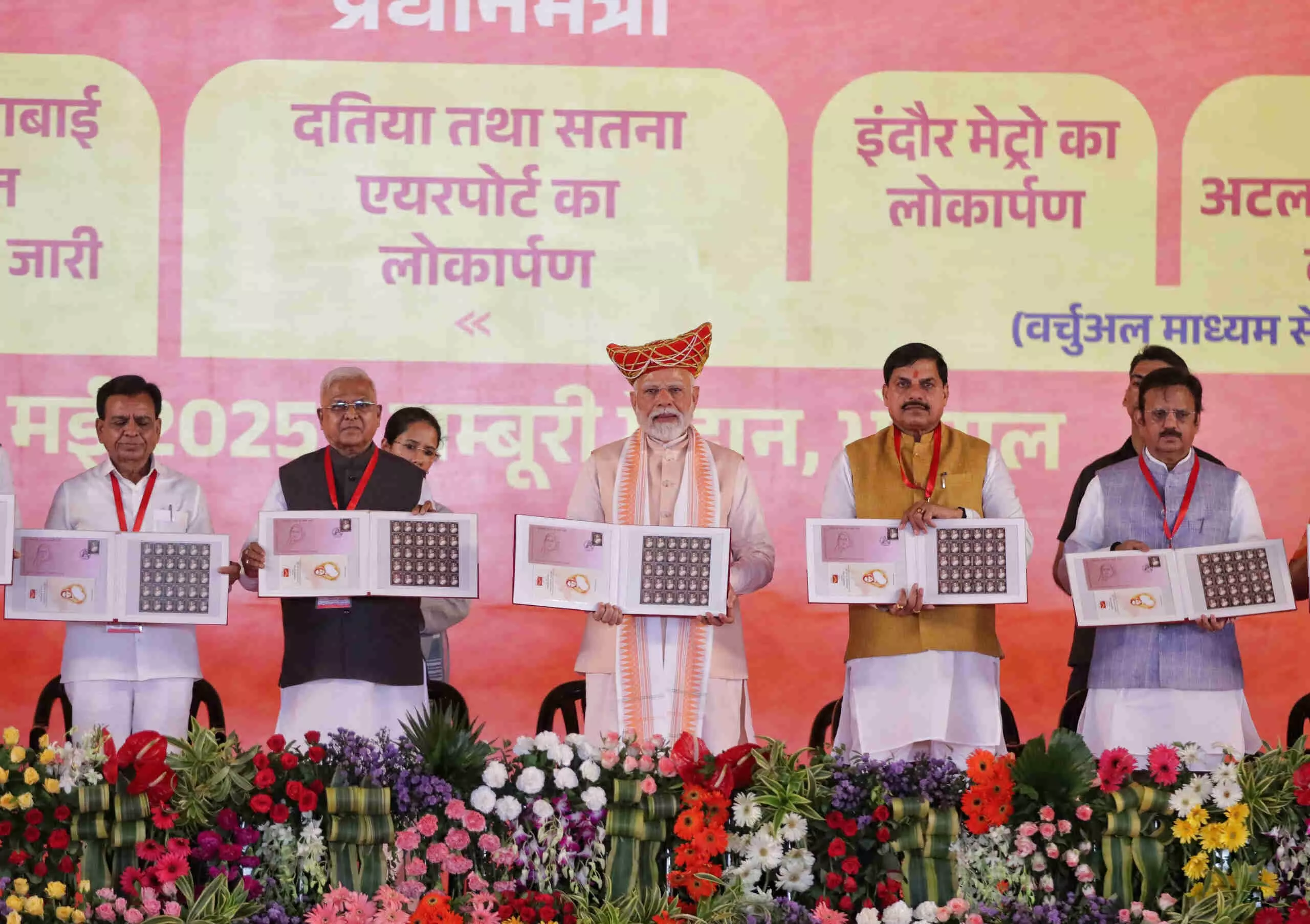 PM Modi Bhopal Visit : प्रधानमंत्री नरेंद्र मोदी ने शनिवार (31 मई 2025) को भोपाल में लोकमाता अहिल्याबाई महिला सशक्तिकरण महासम्मेलन में भाग लिया। देवी अहिल्याबाई होलकर की 300वीं जयंती पर आयोजित इस कार्यक्रम में उन्होंने डाक टिकट और सिक्का जारी किया। मुख्यमंत्री मोहन यादव ने पारंपरिक पगड़ी पहनकर पीएम मोदी का आत्मीय स्वागत किया। यहां देखें कार्यक्रम की प्रमुख तस्वीरें...।