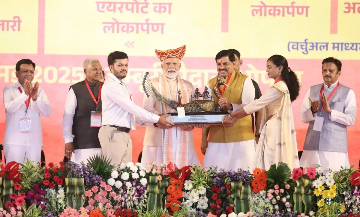 प्रधानमंत्री नरेंद्र मोदी का शनिवार को भोपाल में लोकमाता देवी अहिल्या बाई महिला सशक्तिकरण महासम्मेलन में मुख्यमंत्री डॉ. मोहन यादव ने बैतूल जिले की भैरवा धातु शिल्प कला से बना पुष्पक विमान की कलाकृति सौंपी।