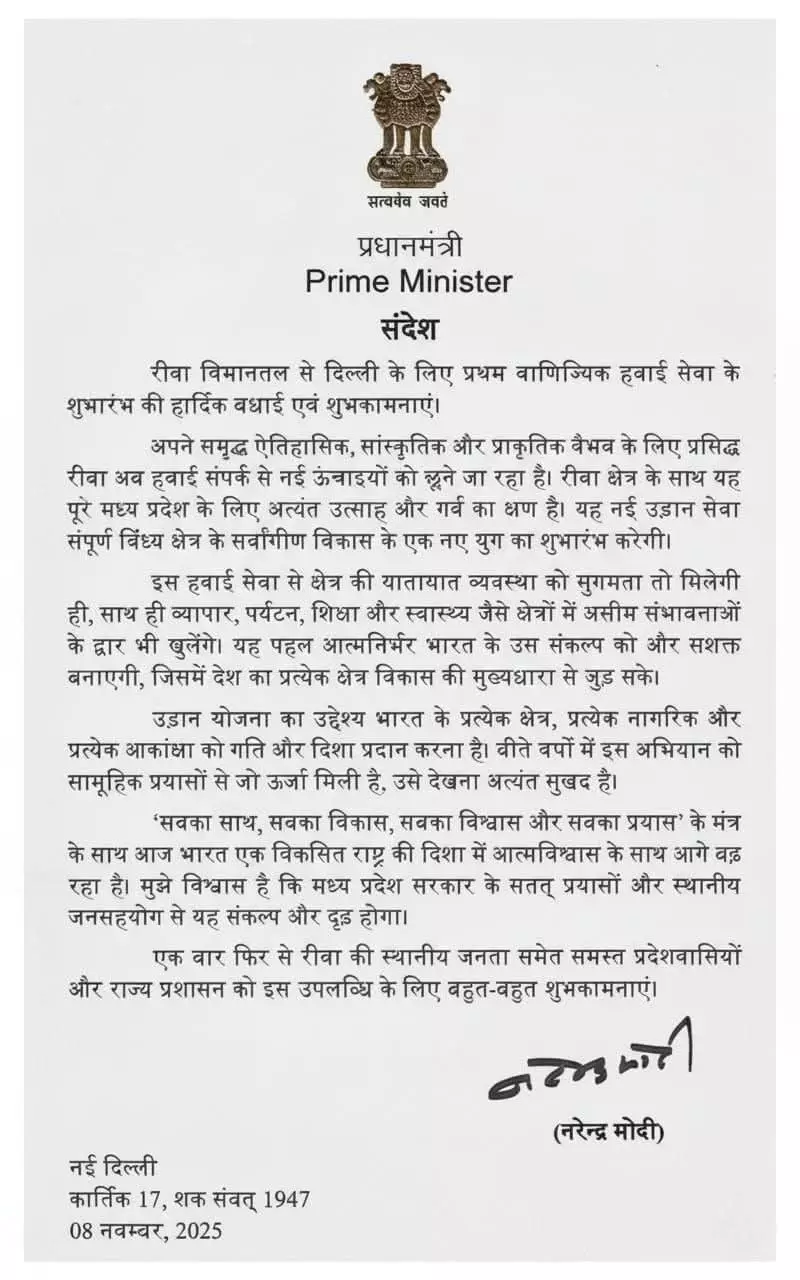 कुल मिलाकर, रीवा से दिल्ली की सीधी हवाई सेवा विंध्य क्षेत्र के लिए विकास की नई उड़ान है, जो रोजगार, व्यापार और पर्यटन के साथ पूरे क्षेत्र की तस्वीर बदलने का वादा कर रही है।